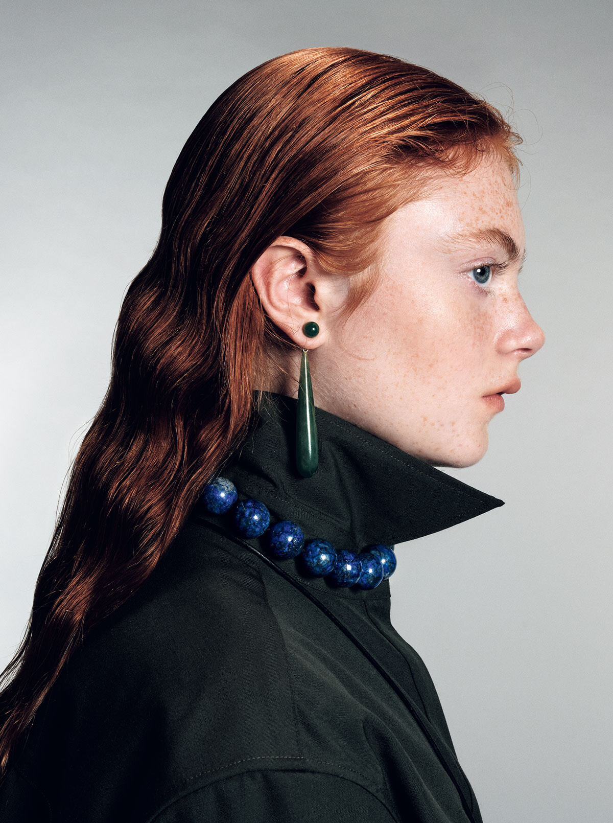 ピアス (925SSLV×ジェイド)¥125,400、ネックレス(ラピスラズリ×925SSLV×18Kゴールドヴェル メイユ)¥108,900/ともにソフィーブハイ(エスケーパーズ アナザーワールド) シャツ¥58,300/サヤカ デイヴィス(ショールーム セッション)