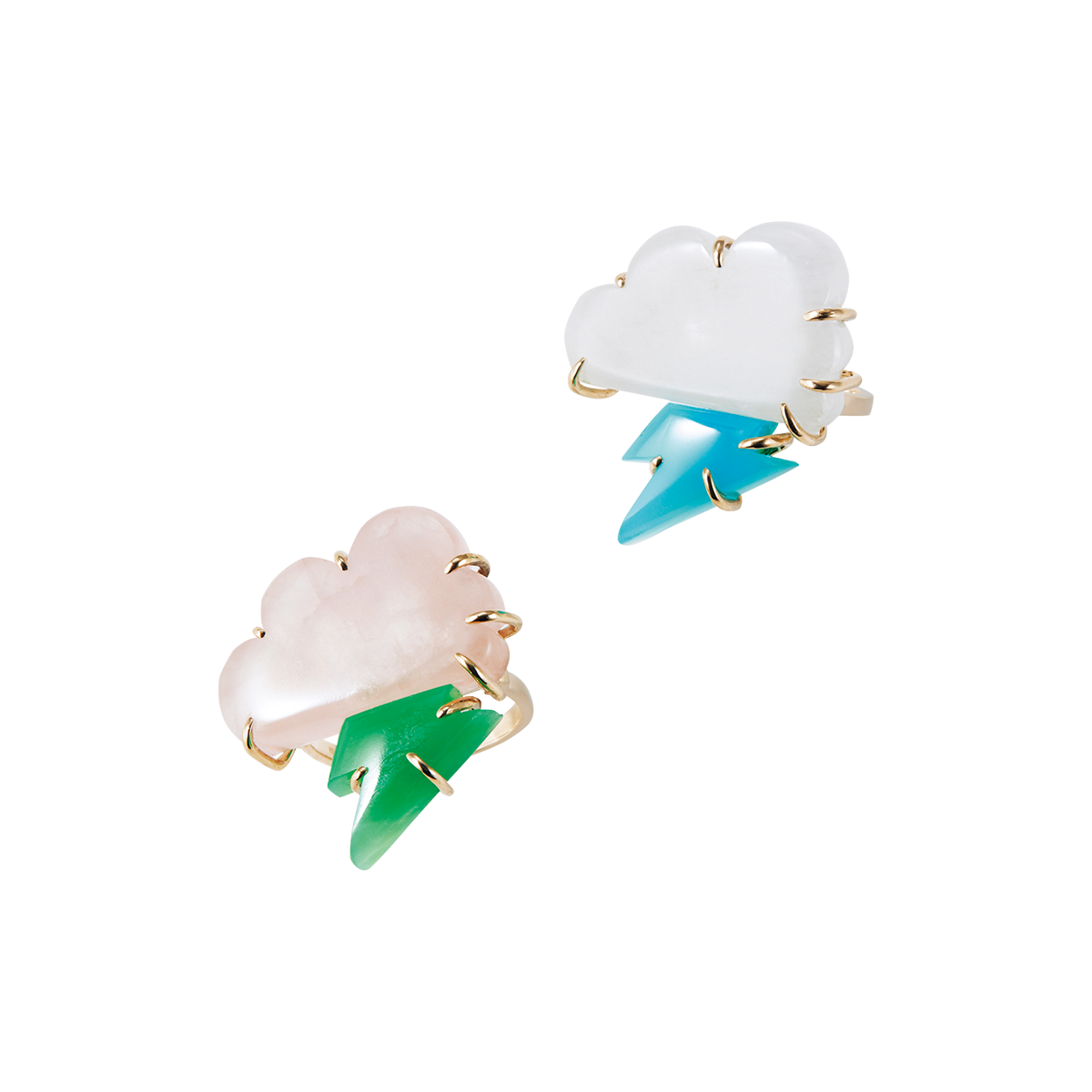 ポップな雷雲のリング上から、(10KYG×乙女鉱山産水晶×シーブルーカルセドニー)、(10KYG×ローズクオーツ×クリソプレーズ)各¥363,000/ともにスクリスタ