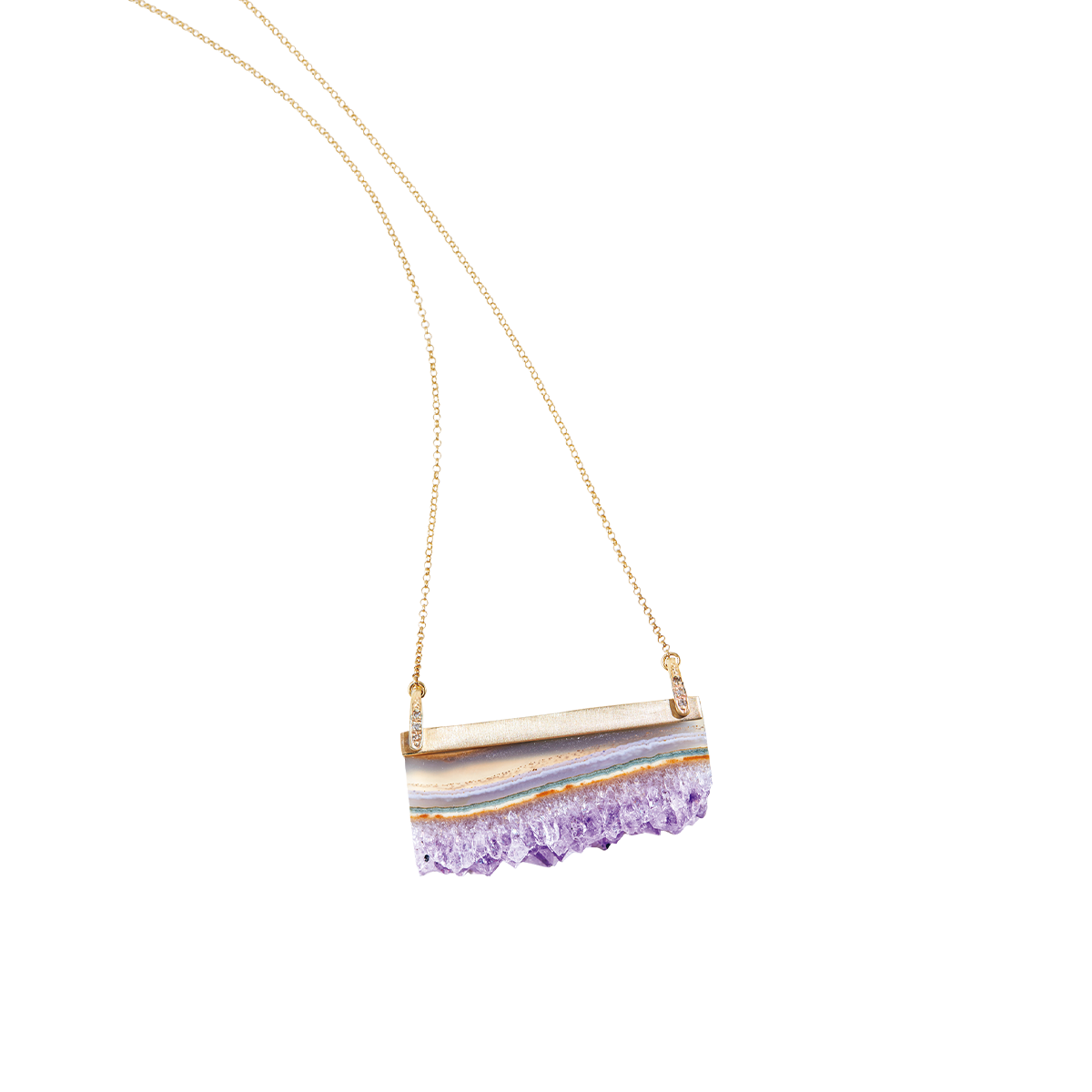 地球の息吹を感じさせる天然石ジュエリーブランド。鍾乳石状に形成されたアメシストを自然のままの形で大胆にスライスしたネックレス。