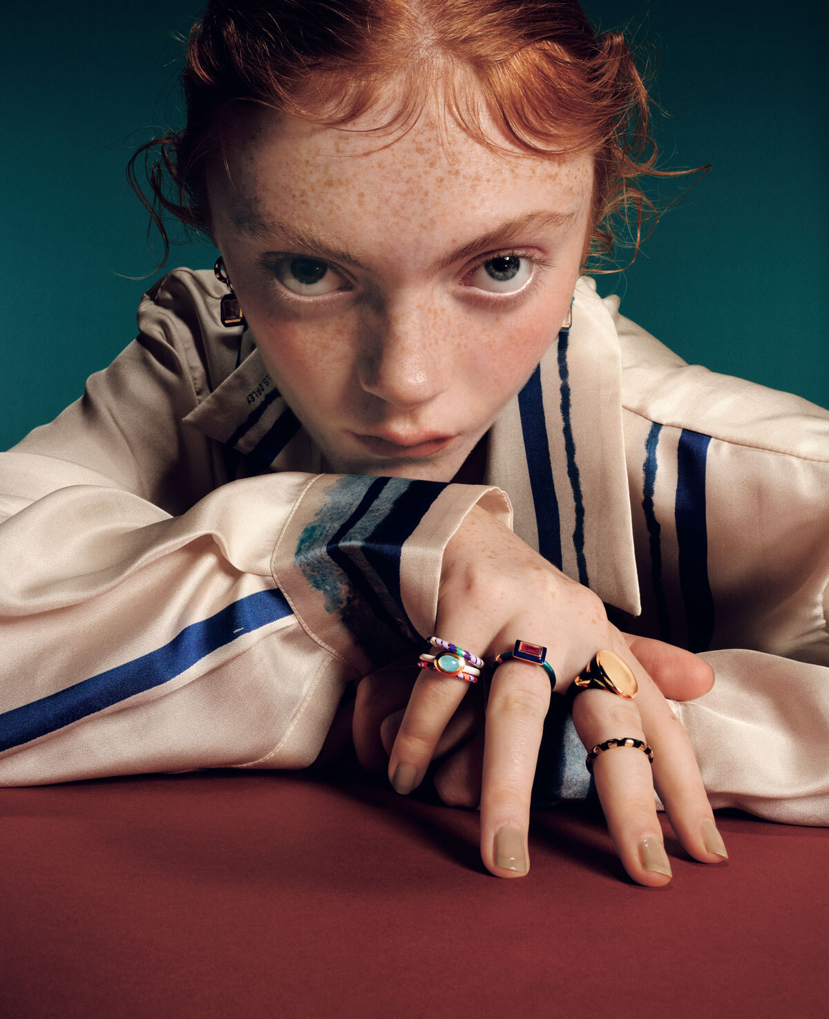 ピアス(14KYG×22KYG×エナメル×SS LV×ローズクオーツ)¥550,000、リングピアス(14KYG×エナメル)¥429,000、リング中指付け根から、(14KYG×エナメル)¥605,000、(14KYG×エナメル)¥231,000、薬指のリング(14KYG×エナメル×ルビー)¥539,000、リング小指付け根から、(14KYG×エナメル)¥308,000、(14KYG×エナメル×ペルーオパール)¥429,000、(14KYG×エナメル)¥253,000/以上アリス・チコリーニ(シハラ ラボ) シャツ¥112,200/エス エス デイリー(ドーバー ストリート マーケット ギンザ)