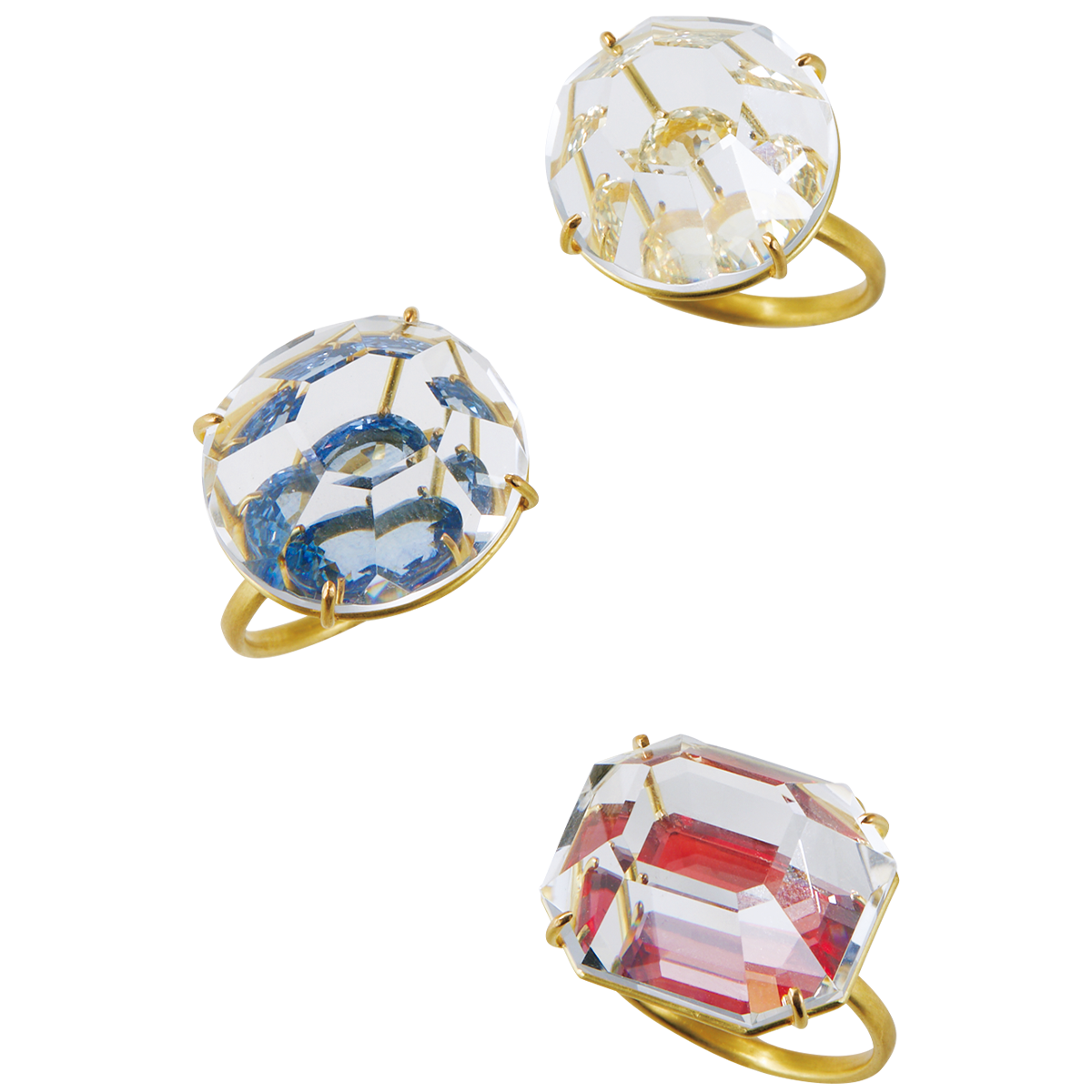 リング上から、(20KYG×イエローサファイア)¥341,000、(20KYG×ブルーサファイア)¥363,000、(20KYG×シンセティックレッドベリル)¥330,000/以上エツコ ソノベ(ギャラリードゥポワソン)