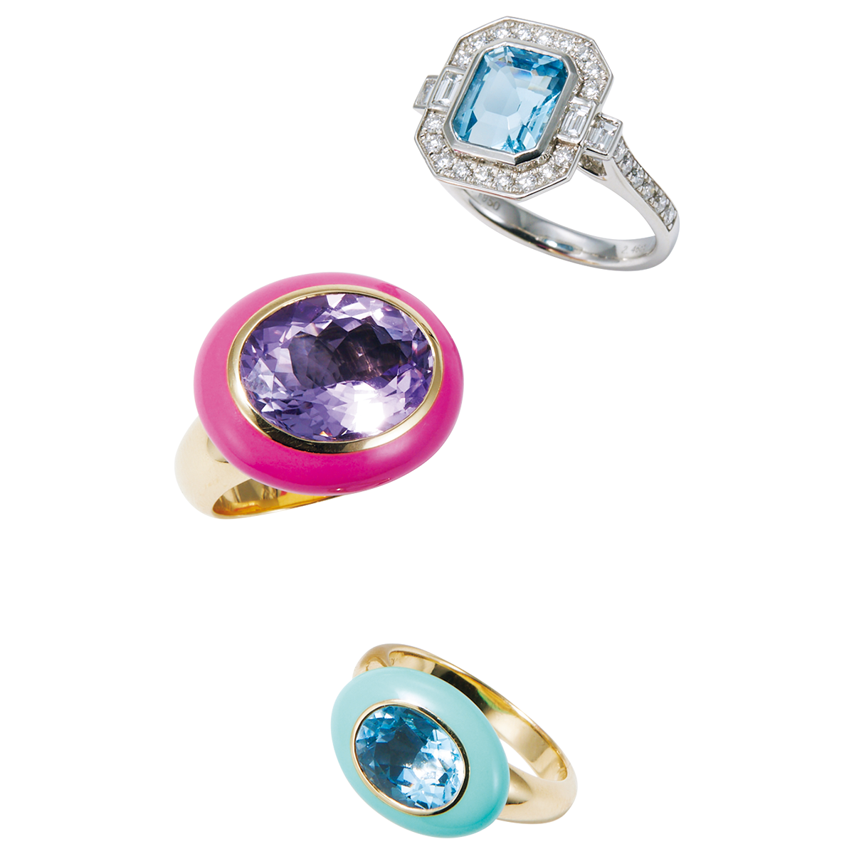 リング上から、(PT×アクアマリン×ダイヤモンド)¥1,925,000、(14KYG×アメシスト×エナメル)¥1,133,000、(14KYG×ブルートパーズ×エナメル)¥748,000/以上ロビンソン ぺラム(チェリッシュ インク)