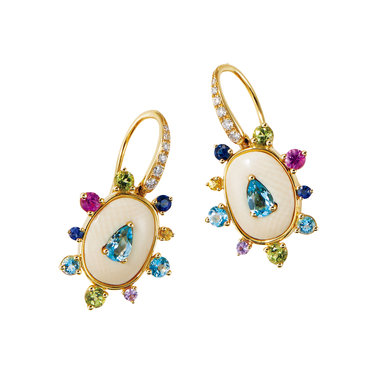 ピアス(18KYG×マンモス牙×ダイヤモンド×マルチサファイア×ペリドット×ブルートパーズ)¥1,419,000/フランチェスカ・ヴィッラ(シハラ ラボ)