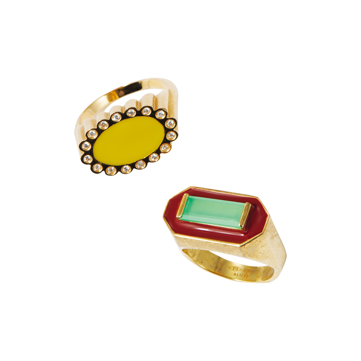 リング 上から、(18KYG×ダイヤモンド×エナメル)¥476,300、(9KYG×クリソプレーズ)¥207,900/ともにアリータ(ブルーベル・ジャパン)