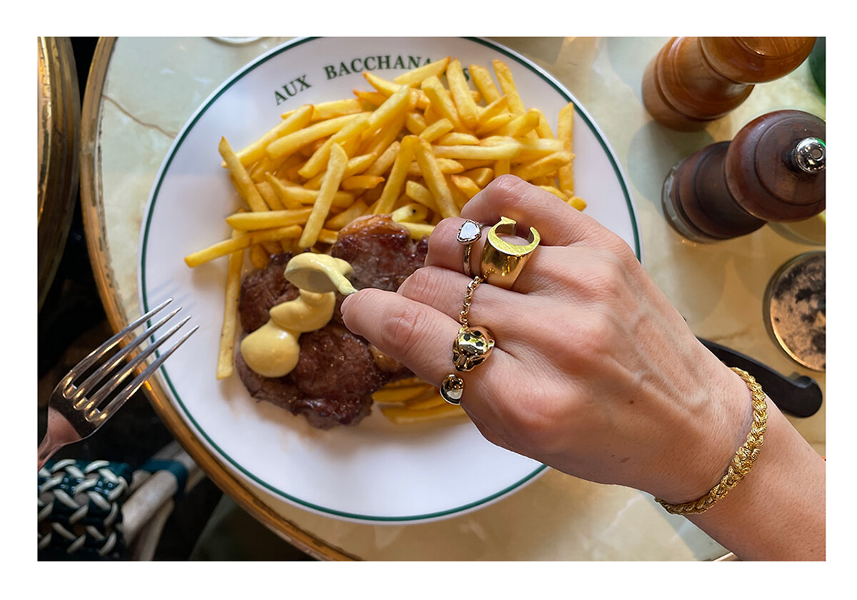 その日の気分やフィーリングが基本ですが、片手をボリュームたっぷりにレイヤードしたら、もう片方はシングルリング、というように”アンバランスなバランス”を保つようにしています。ファッションと言うより、ジュエリーは御守りのような意味合いが強いので、祖母、叔母、母の形見のどれかを先に選んで、それに合うバランスで重ねていきます。