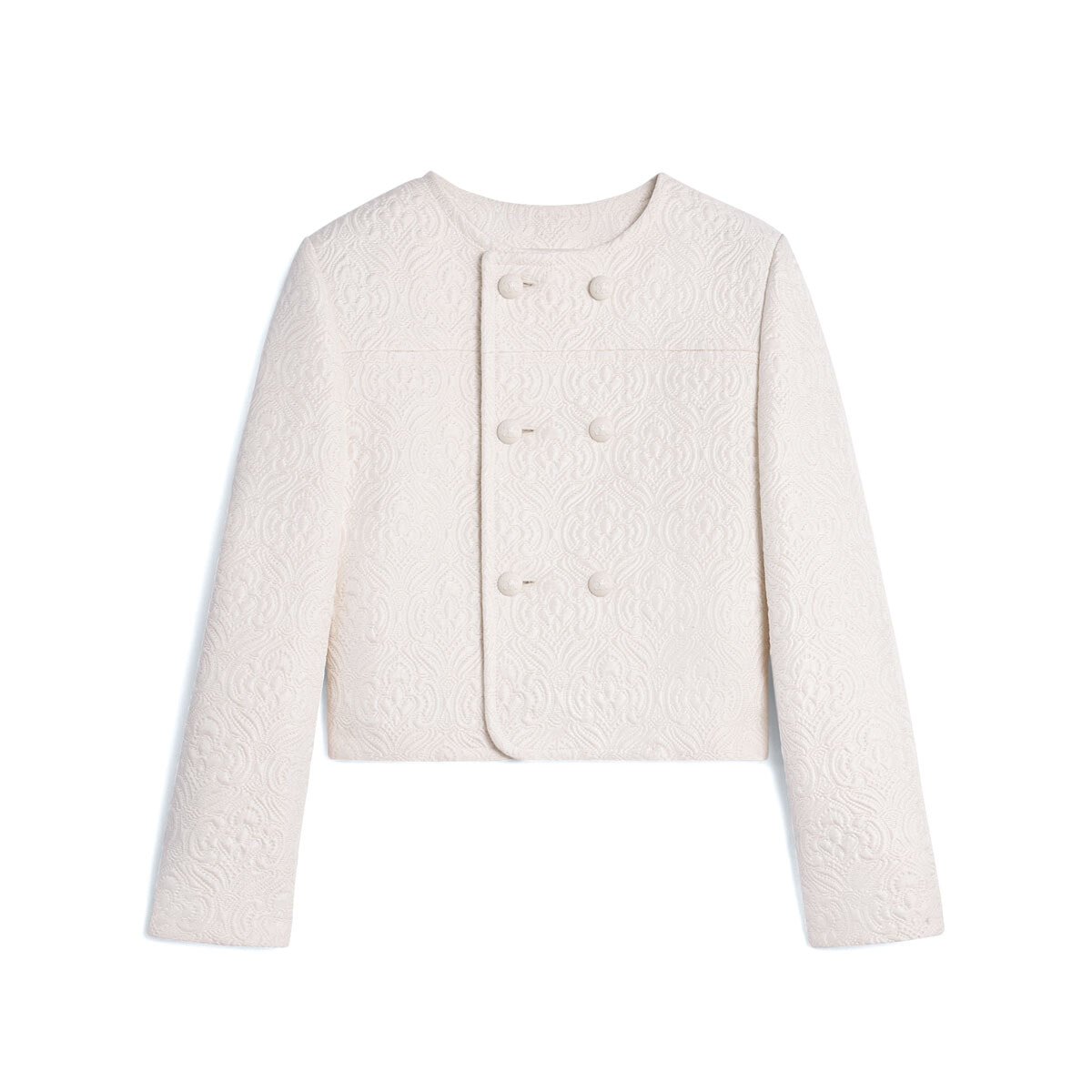 ダマスク柄のエンボス加工が施されたノーカラーのダブルブレストジャケット。ウールとシルクのほどよい光沢感とクラシックな形が上品。ホワイトのボタンにもさりげなくトリオンフが。