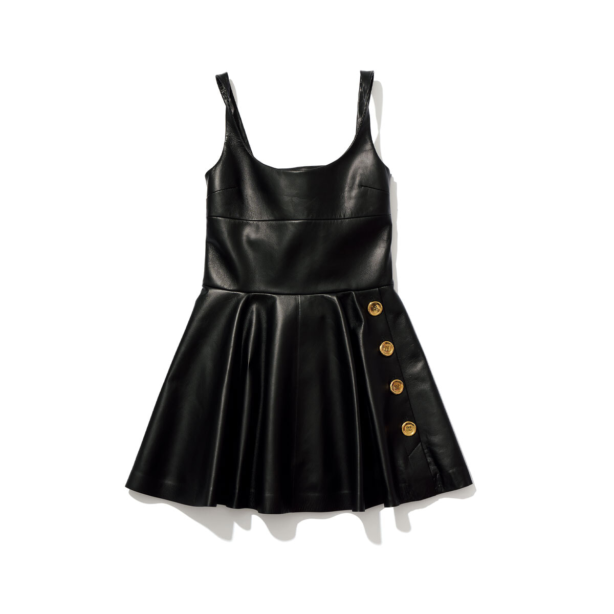 2025年春コレクションより、シックでありながらどこかパンキッシュなムードを醸し出すショートドレス。レザーのプリーツスカートは歩くたびに軽快に揺れ動き、エフォートレスなパリジェンヌを体現する。