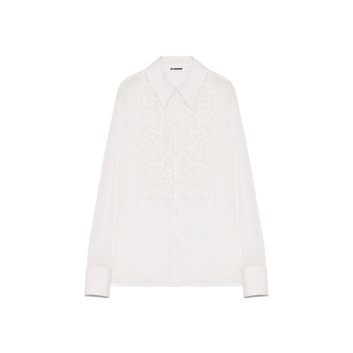 フロントにフリルをあしらったホワイ トのシャツブラウスはノーブルな佇まい。プレーンすぎないほどよいデザインで、どんなコーディネートも品よく昇華してくれる。