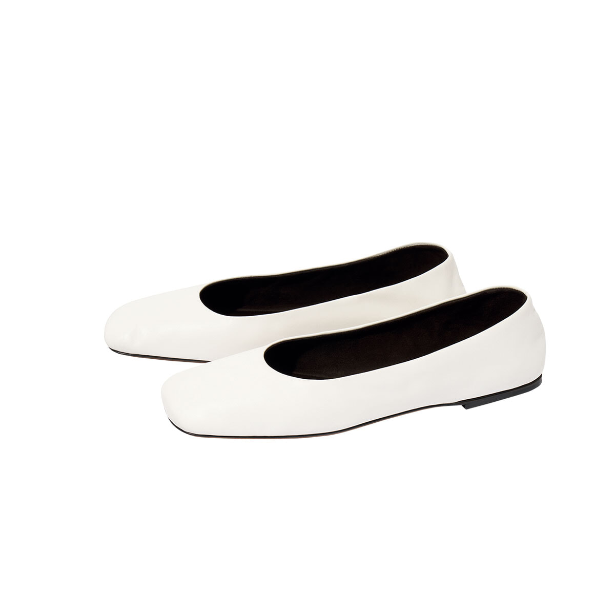 軽くてソフトな履き心地のバレリーナシューズ。スクエアトウでフロントが浅めに設計されたモダンな佇まい。装飾が削ぎ落とされたクリーンなホワイトカラーだからどんなシーンでも活躍しそう。