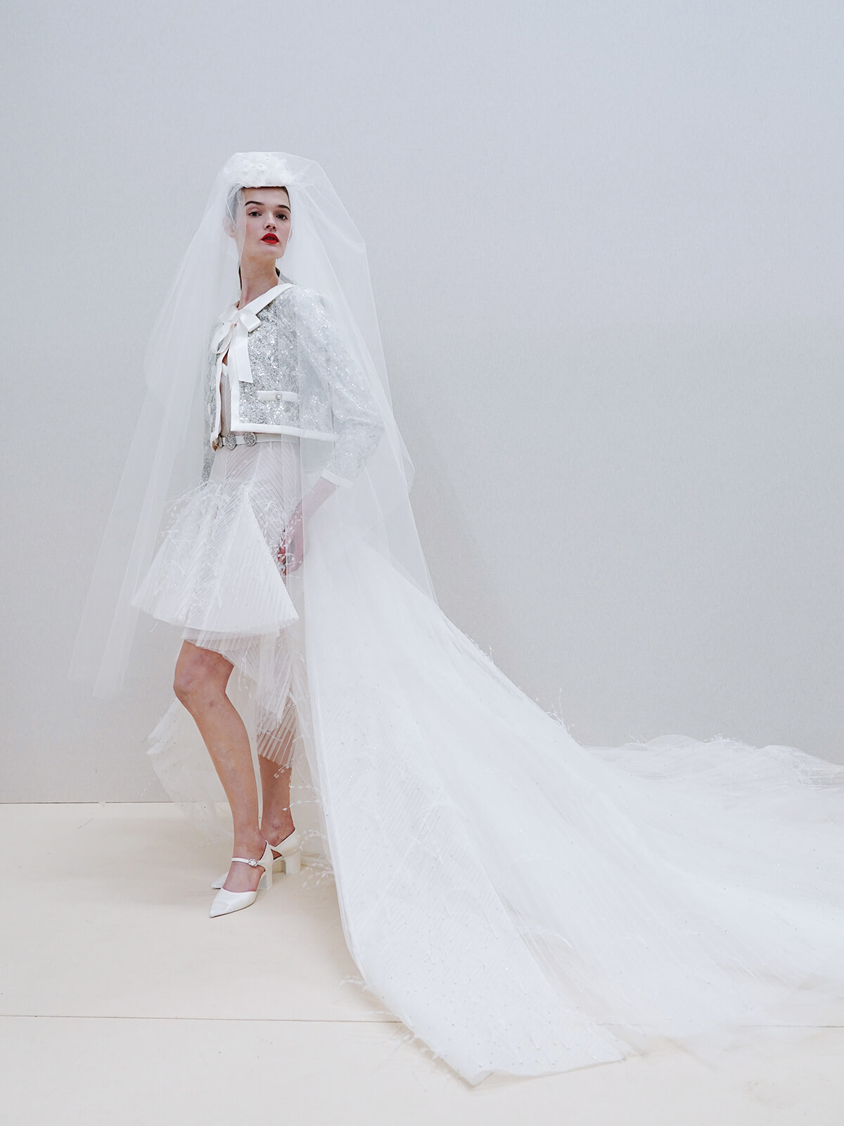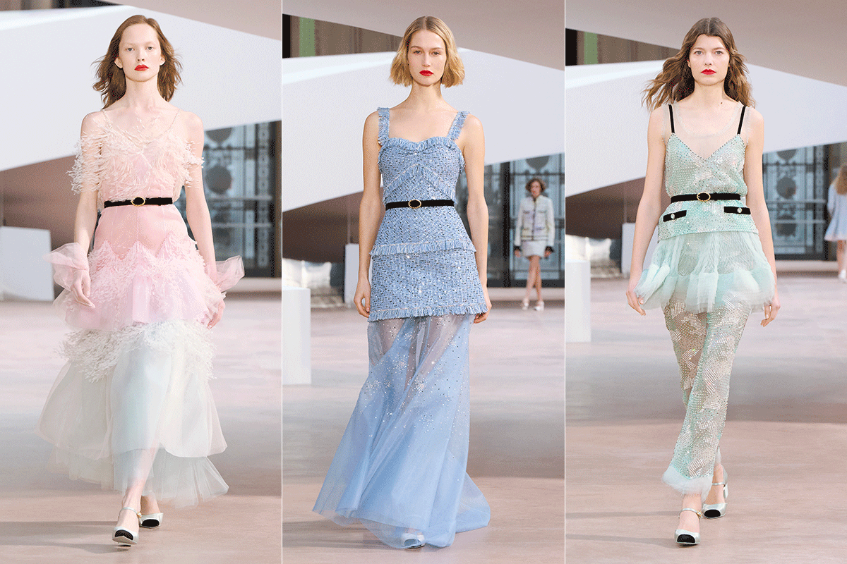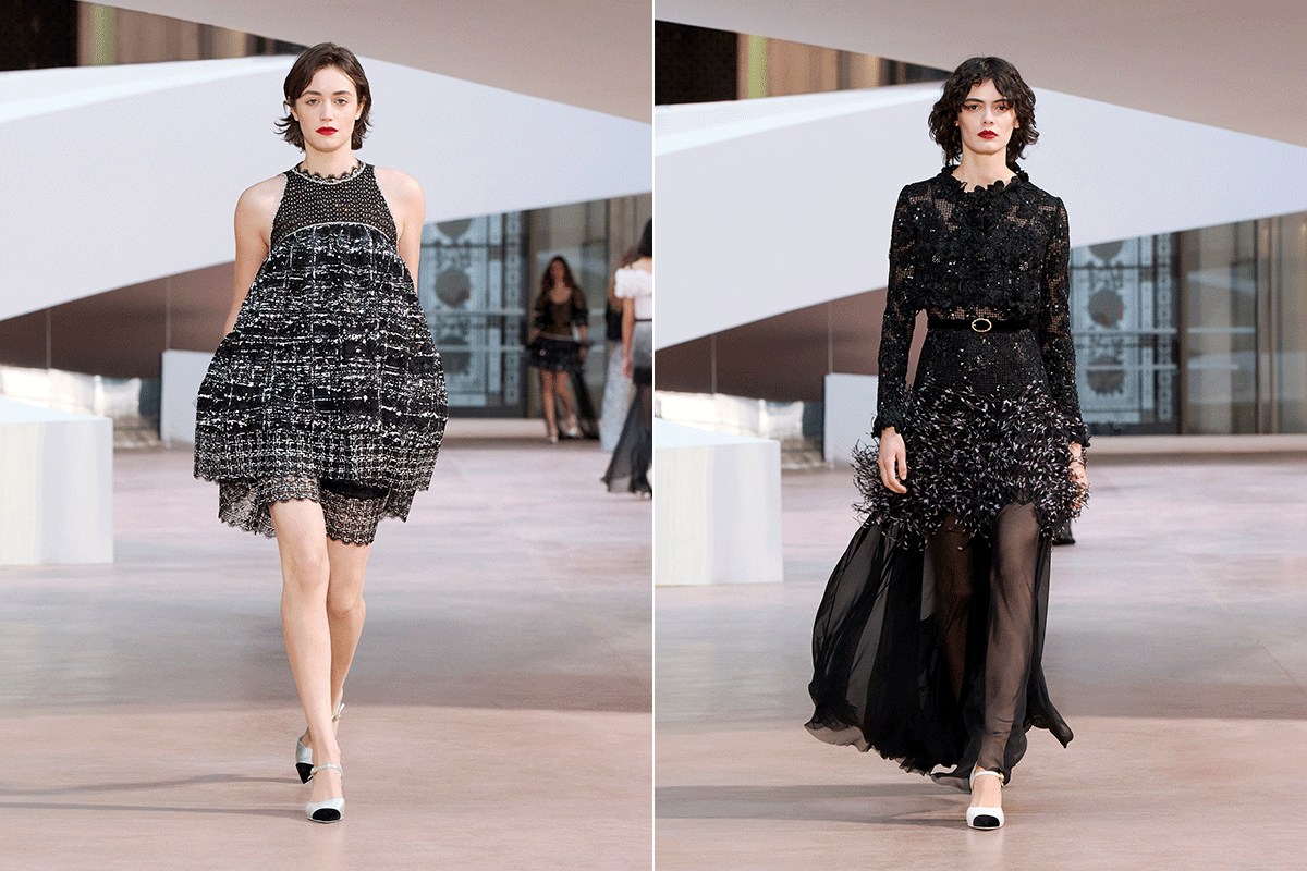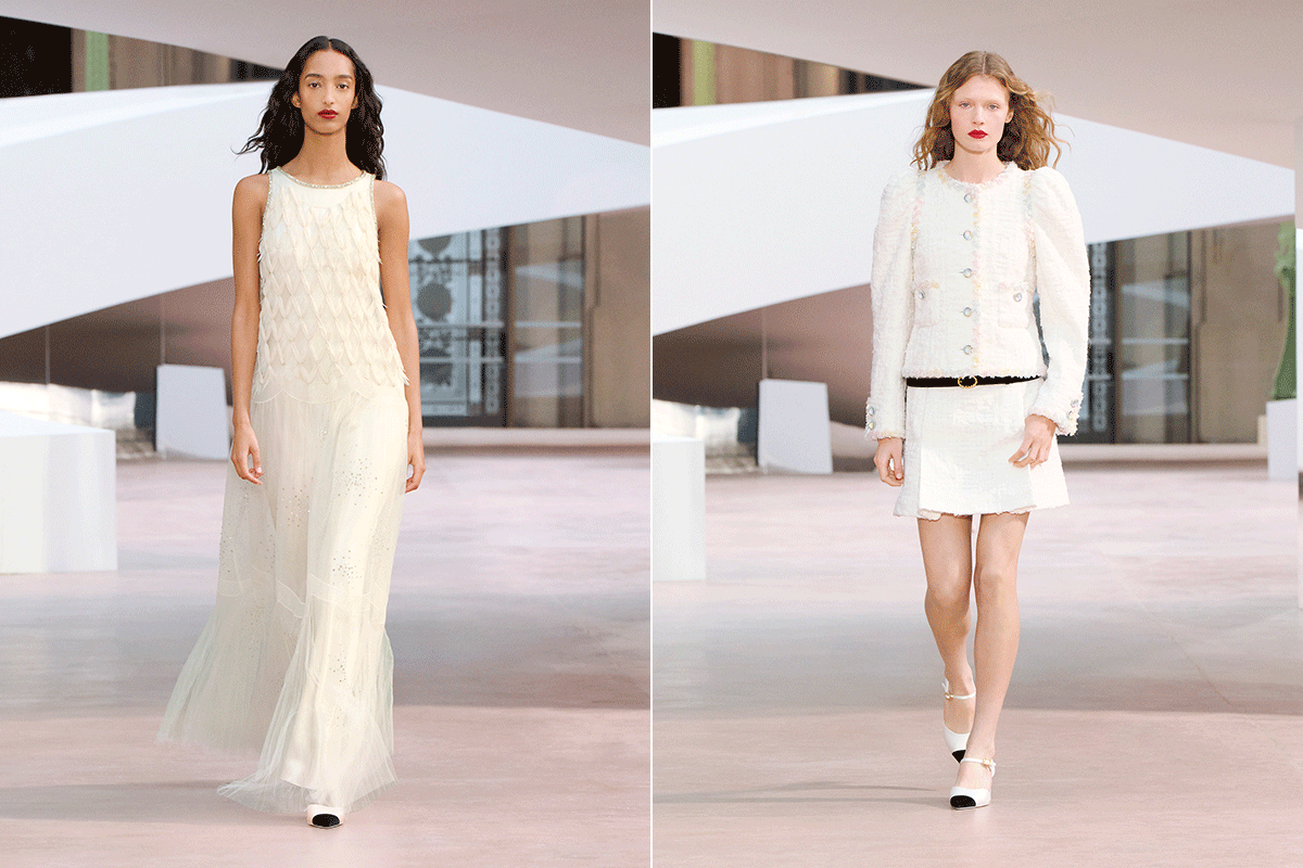 ショーの幕開けを飾ったのは、シャネルらしい白にドリーミーなパステルカラーを滲ませたツイードスーツ。透ける素材の軽やかな白いドレスには、美しい刺繍や繊細なプリーツのディテールが散りばめられ、オートクチュールの洗練された技術を凝縮した仕上がりに。エレガントなシャンパン色のツイードコートには、白いシークイン付きドレスを合わせて、手仕事が生み出す完璧なバランスを披露した。