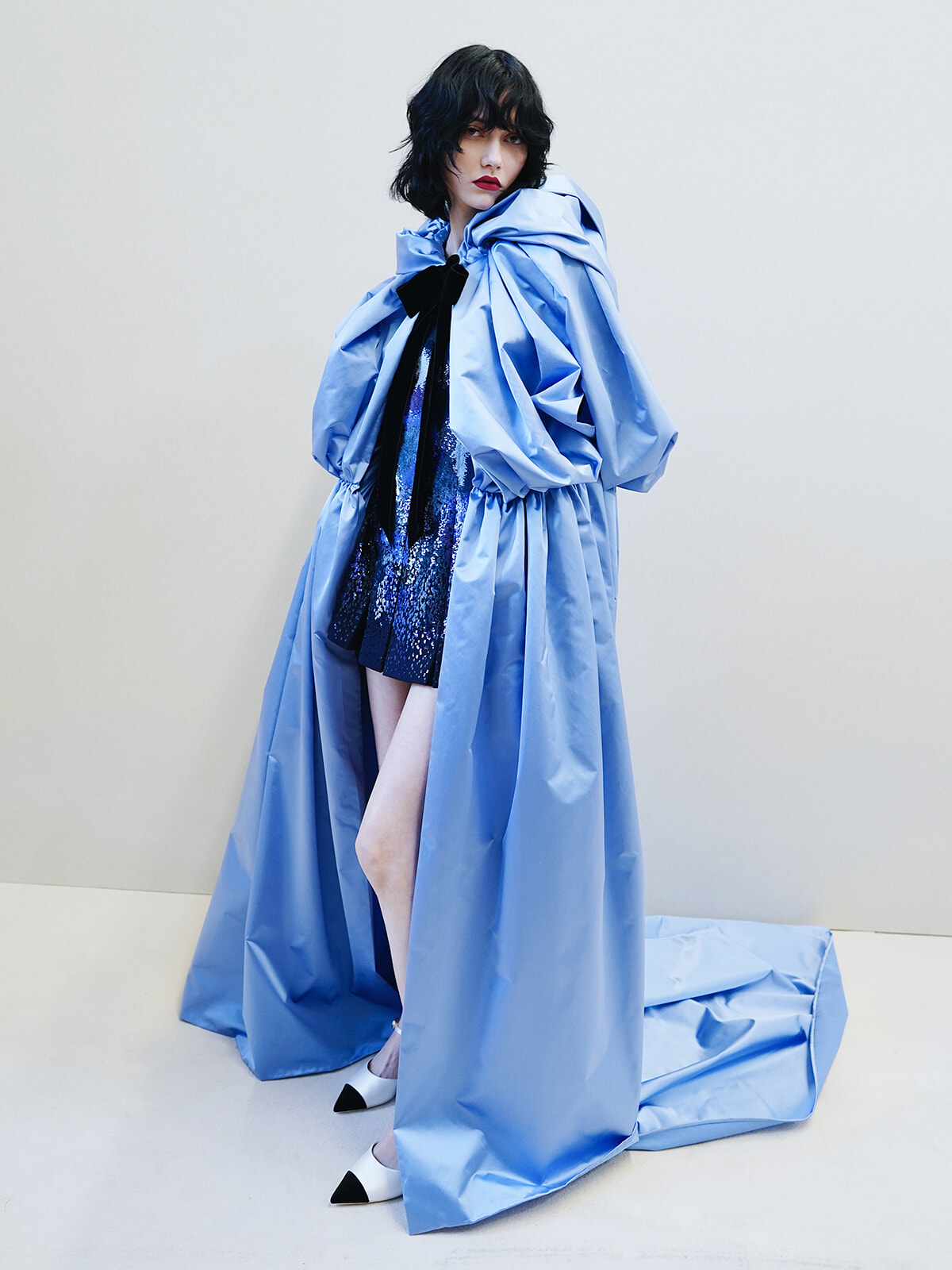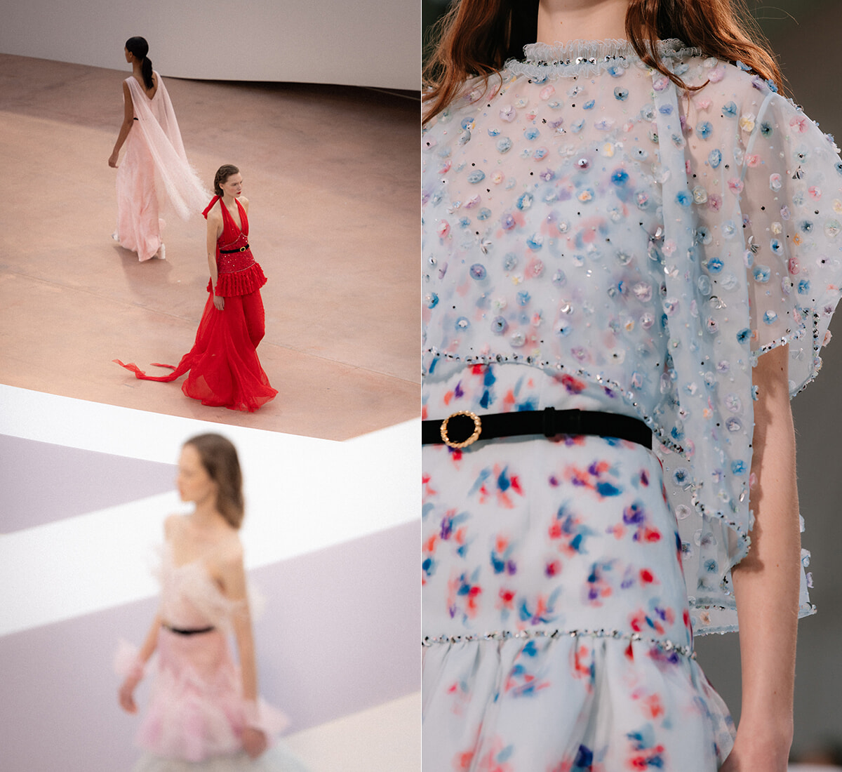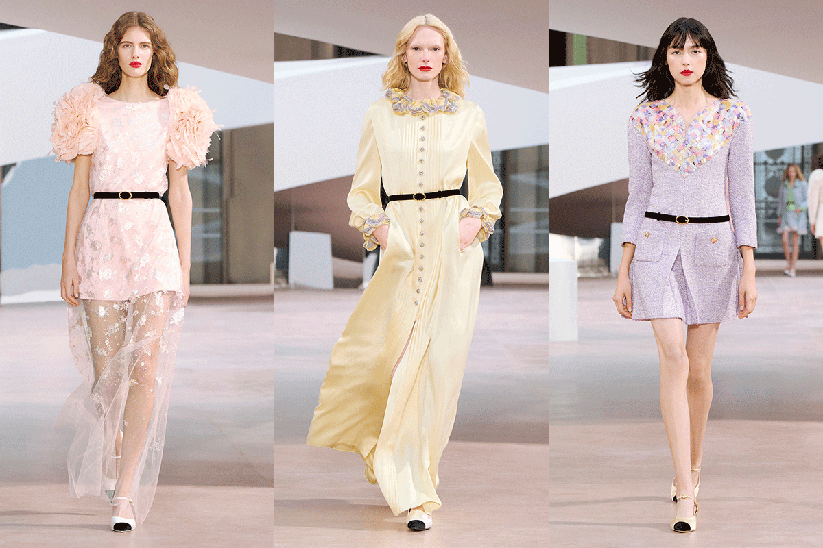 淡く柔らかなパステルカラーからビビットな色調まで、印象的なカラーがコレクションに彩りを添える。サンシャインイエローのツイードスーツにボックスプリーツをあしらったライラックのツイードドレスや、オレンジピンクのコートにペールピンクのフラウンスがついたミモザ色のドレススーツなどがコレクションを華やかに盛り上げる。オートクチュールらしいエレガントなドレスにも色を載せた。刺繍が施されたシフォンの赤いドレス、淡いイエローのダブルサテンのプリーツが入ったプラストロン付きシャツドレス、スカイブルーのロングパッファーケープなどで、卓越した技術を駆使したシャネルのオートクチュールの世界を印象付ける。そして、足元に合わせたスカイブルーやバイオレットのフラットシューズやヒールも装いのアクセントに。