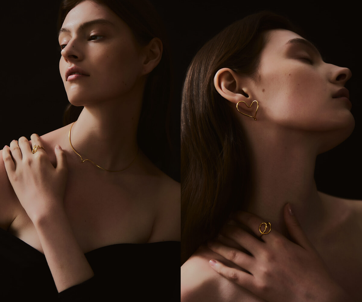 新作の「デリケート ロマンス」は、センチメンタルな感情とロマンスを”核=heart”とした、一体感を探求するコレクション。ハートやリボンといったフェミニンなモチーフも繊細なデザインと流麗なラインでジュエリーに昇華させている。(左写真)チョーカー¥62,700、リング¥35,200  (右写真)イヤリング¥49,500、リング¥35,200。素材はどれもリサイクルシルバーに18KYGのプレーティングを施したもの。