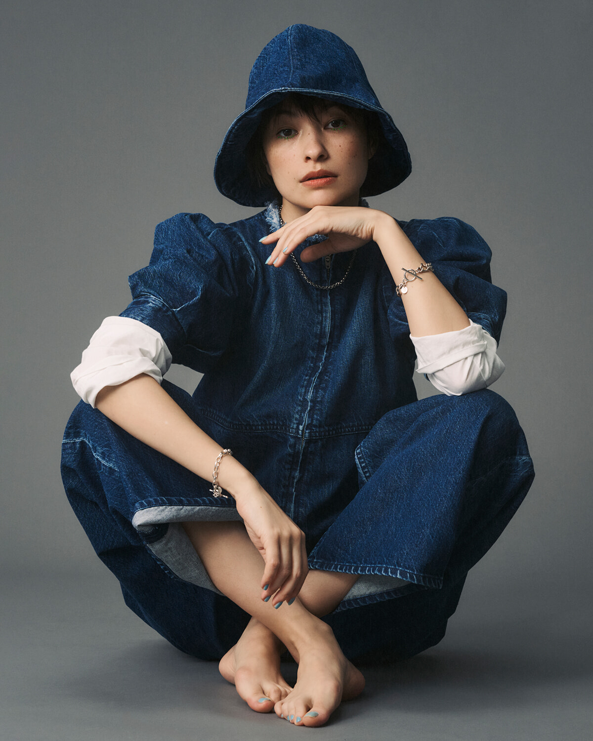 「きれいなワークスタイルを意識して、デニムオールインワンのシルエットにとくにこだわりました。オールインワンはバランスが難しいアイテムですが、ウエスト位置を少し上げることで、全体がすっきりと美しく見えるよう工夫しています。私自身もツナギが好きで、普段から研究している中で得たアイデアを取り入れ、1枚で完成するシンプルなデザインを形にしました。デニムのハットは、スーツのセットアップのように、オールインワンとあわせて楽しめるように作っています」と山本マナは語る。