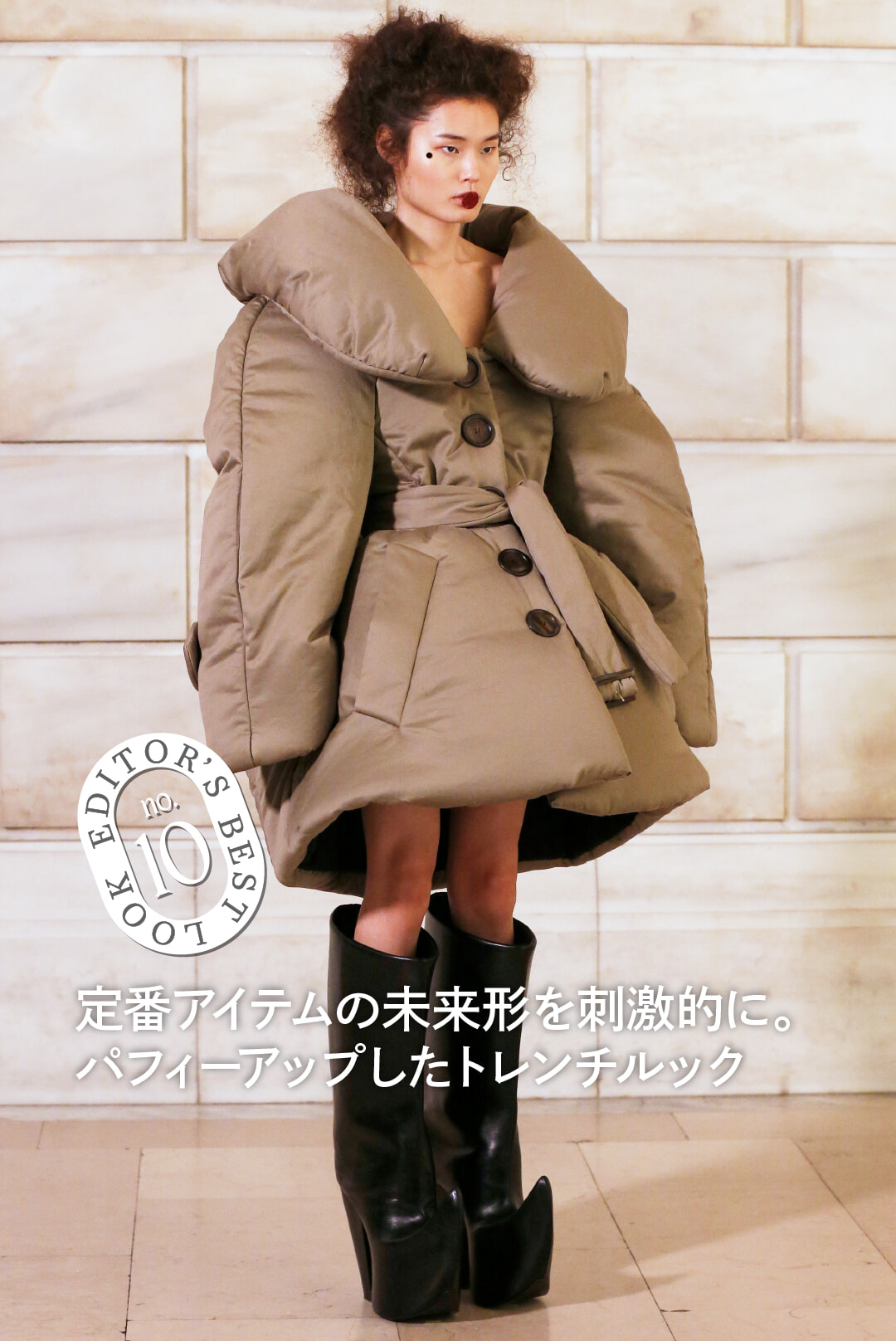 印象的だったのは、パフィーにボリュームアップしたトレンチに、極端に先をとがらせた黒ロングブーツを合わせたルック。定番アイテムの未来形を刺激的に提案。