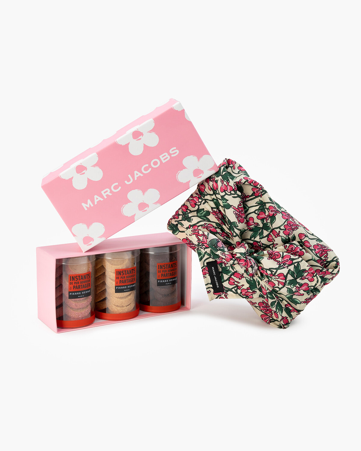 さらに、ツイードシリーズのポップアップ限定色や限定品、ランウェイインスパイアの新シグネチャー「ザ デュアル バッグ」にチャームをあしらったエクスクルーシブアイテムや、ピエール・エルメ・パリで人気のサブレ3種をオリジナルのボックスとアーカイブファブリックを使用した風呂敷で包んだ「マーク ジェイコブス × ピエール・エルメ・パリ サブレセット」も数量限定で発売。