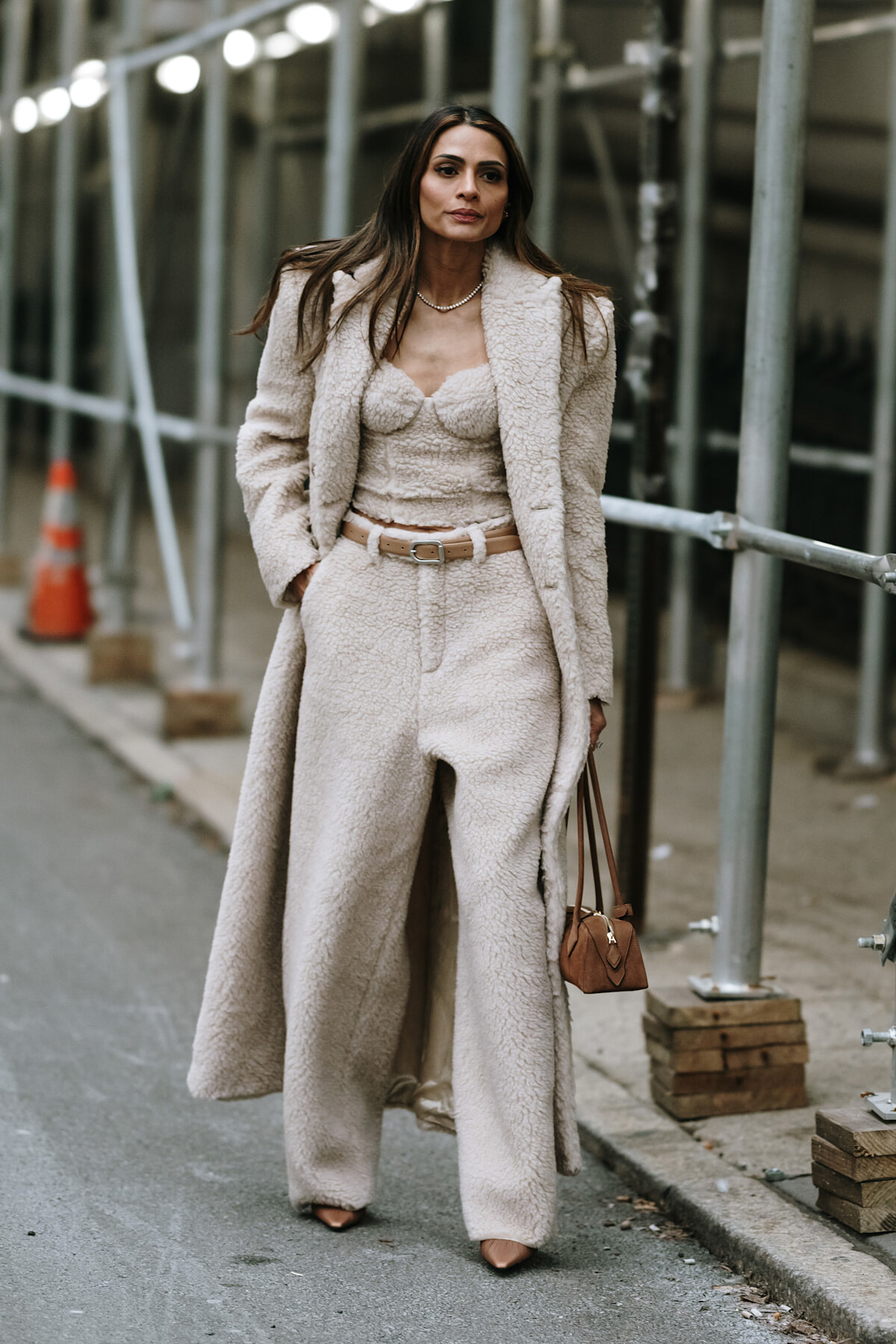 全身フラッフィーなアイテムを纏っていても甘くなりすぎないのは、仕立てのよいセットアップで着用しているが故。ベージュトーンで合わせてノーブルに着こなして。アライアの「LE TECKEL」を合わせて、トレンド感も忘れずに。