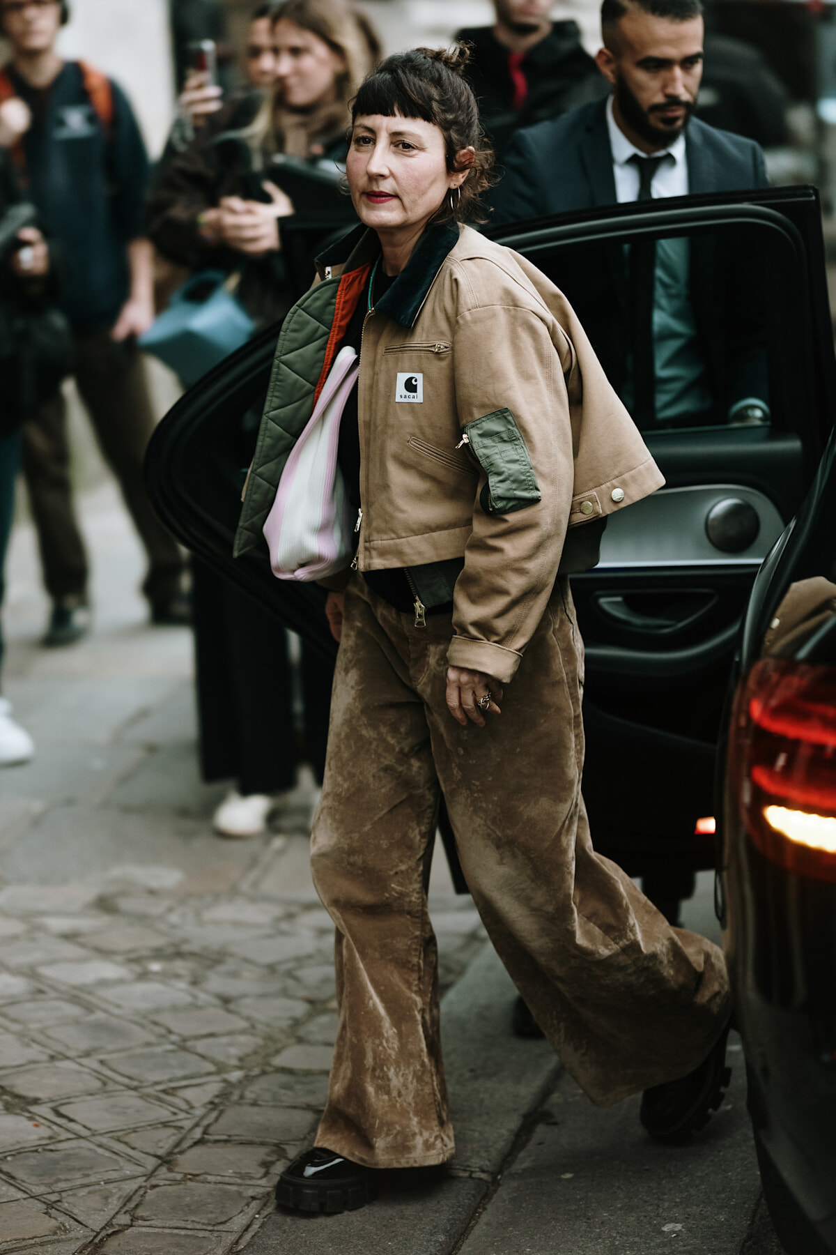 クラシックなジャケットに合わせたのは、相反するようなユーティリティパンツ。ボーダーレスに着こなすファッションの楽しみを体現するような着こなしは、今すぐ真似したい!