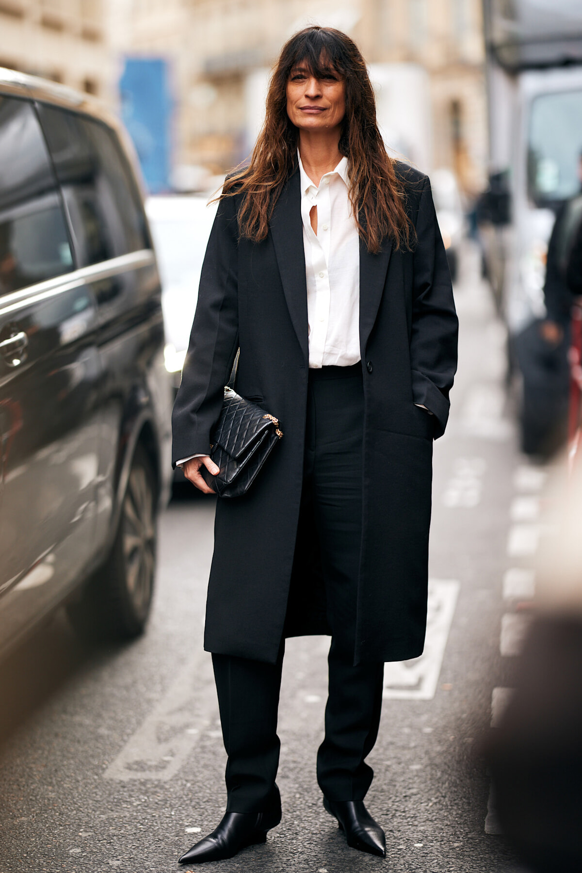 圧倒的な存在感と変わらないスタイルで私たちを魅了し続けるキャロリーヌ・ドゥ・メグレ。この日はロングジャケットにハリ感のあるシャツを合わせて、とことんマニッシュに。胸元の開きやノージュエリー、ラフなヘアスタイルがノンシャランなムードを演出。