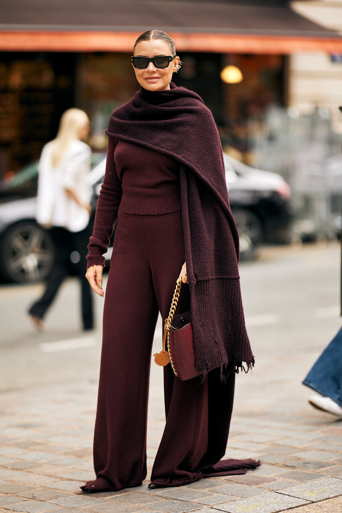 温かみのあるボルドーカラーのニットをセットアップで着こなした彼女。ルーズに着るなら、ヘアメイクはしっかり目に、ジュエリーライクなバッグを合わせるなど、リュクスなムードをプラスして。