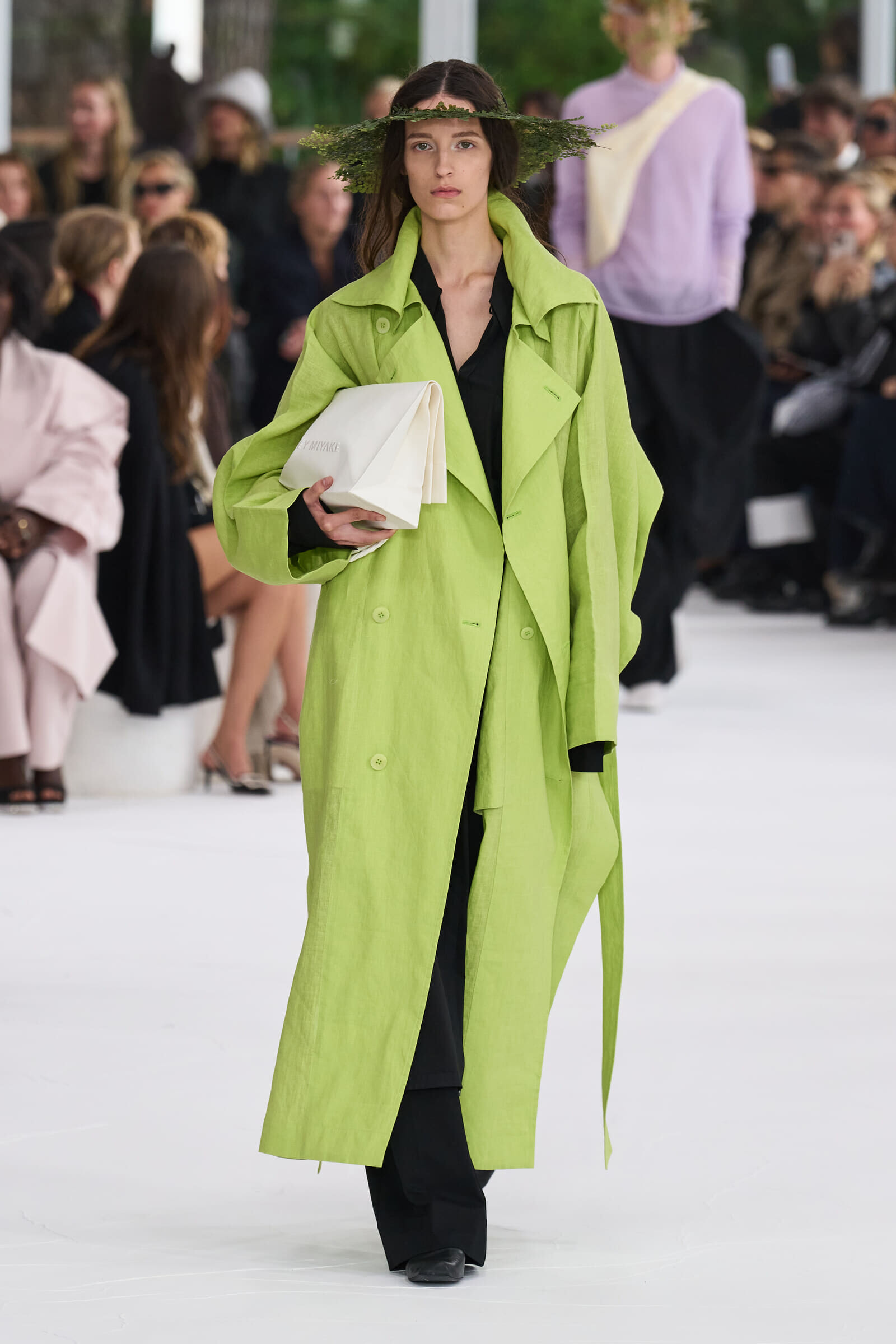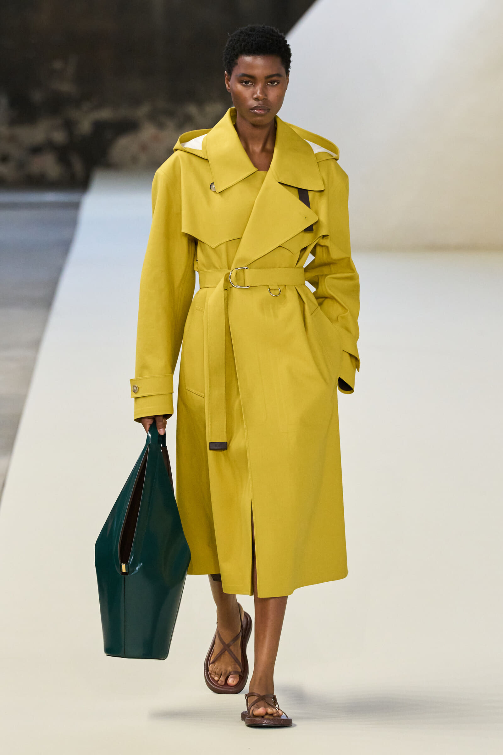 大胆なカラーリングを主役にしたスタイリングが多く見られ、ほかのアイテムはトーンダウンさせることで、その存在感を引き立てるルックが印象的だった。春の陽気なムードにぴったりなカラートレンチは、日常のコーディネートに華やかさを加える一着に。
