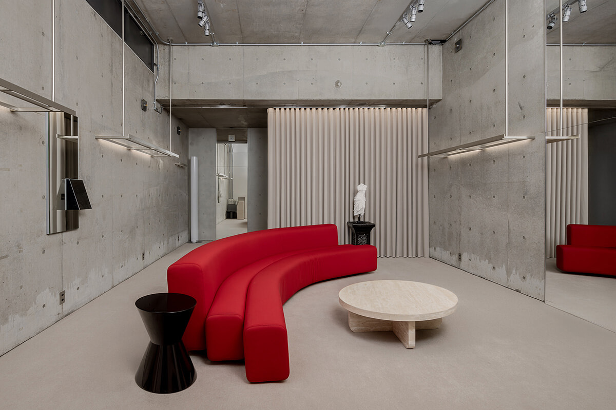 この直営ブティックは、著名な建築家・磯崎新のキャリア初期の貴重な建築物の1階をアトリエに、地下1階をプライベートブティックとして再構築したもの。ピエール・ポランの彫刻的なソファを置いたプライベートサロンのような落ち着いた空間で、ゆったりとショッピングを楽しめるのが魅力。