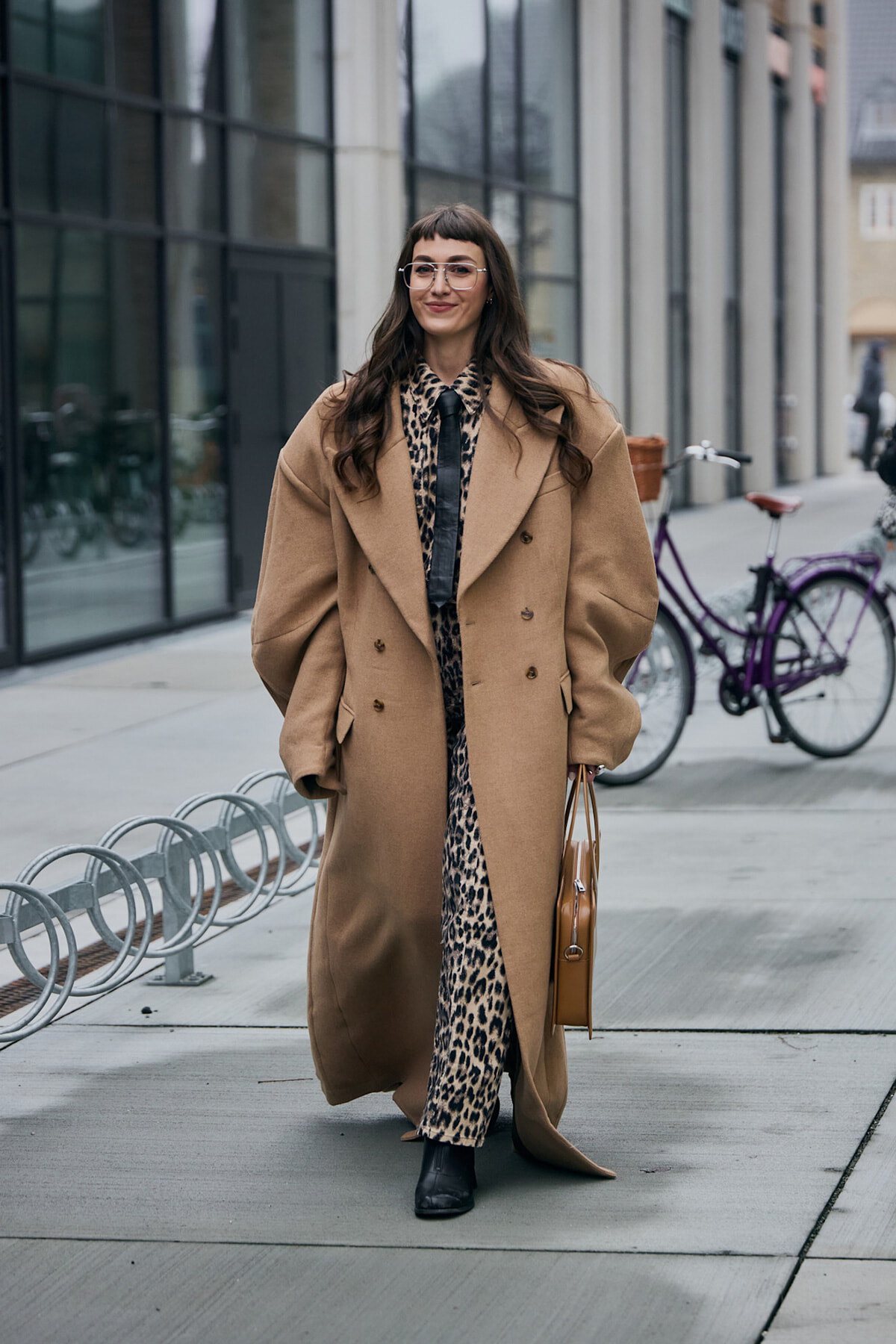 大胆に取り入れるのは、コート以外にも選択肢が。シャツ地のロングドレスには、柄に負けないくらいフォルムがユニークなキャメルのコートをチョイス。カラートーンを合わせてニュートラルに着こなして。