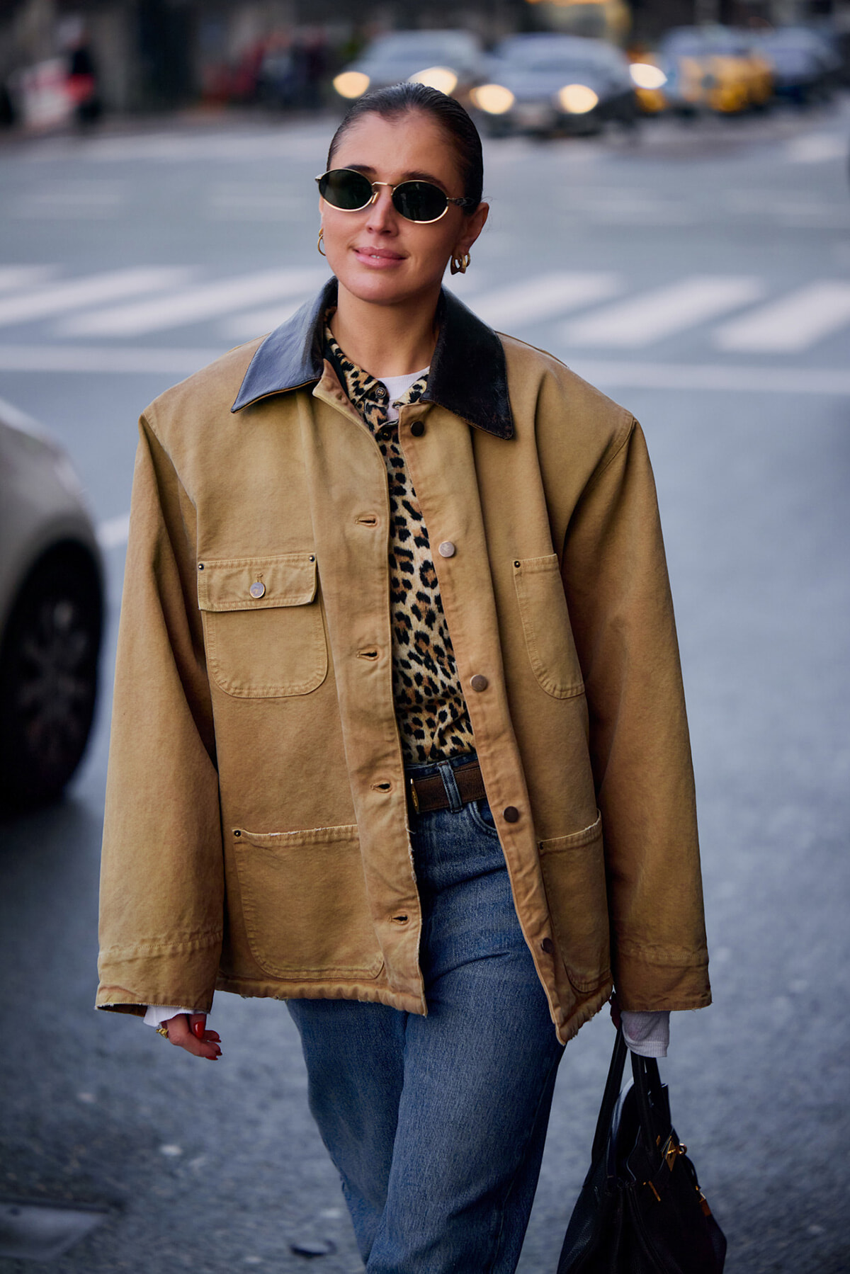 プラダのユーティリティジャケットをメインにしたインフルエンサー、ダルジャ・バラニク。ラギッドなアイテムには、レオパード柄のシャツでレディなムードを取り入れて。首元や手元から見えるロンTの白が◎。