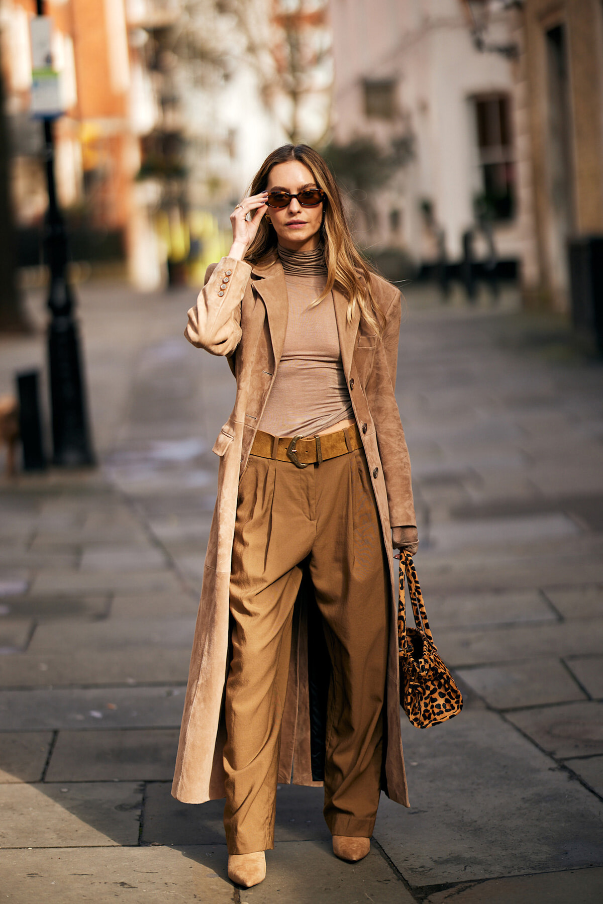 もっとシックに着こなすならば、バッグだけで取り入れるのも◎。何気ないスタイリングもシアーなトップスやタックの入った太めのパンツなど、トレンド感のある質感やフォルムのアイテム選びを意識して。
