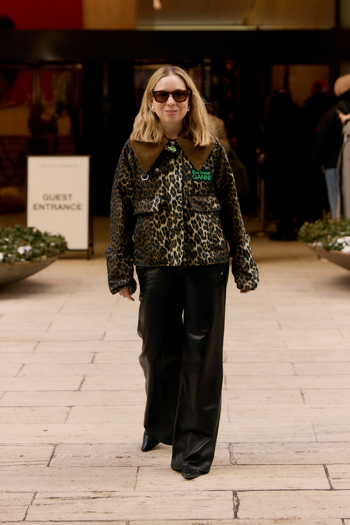 サステナブルなアプローチを重視しているコペンハーゲン発の「ガニー」と、イギリス王室公認の「バブアー」とコラボしたブルゾンをチョイスしたUA版L’OFFICIEL Magazineの編集長キャロライン・グロッソをキャッチ。キュートなイメージのブルゾンを、レザーパンツや大ぶりのパールのピアスを合わせてジェントルウーマンなスタイリングに。