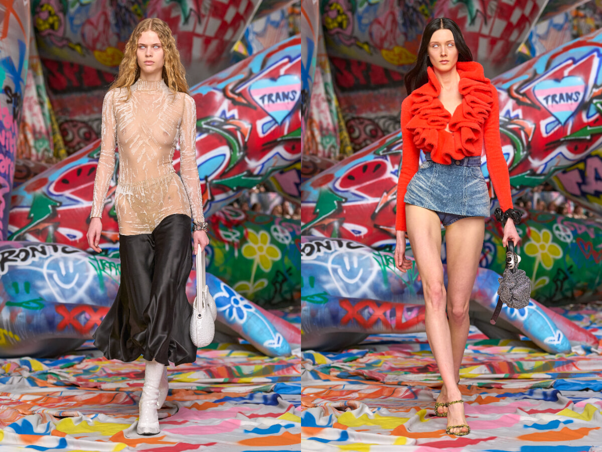 コレクションはデニムをはじめ、ユーティリティやポップ、職人技といったディーゼルのアイデンティティを大胆に表現。象徴的だったのは、極端なローライズのデニムやスカート。挑発的なシルエットとヴィンテージ風デニムが、ブランドの反骨精神を体現する。さらに、プラスチックコーティングされたジャケットやビスチェなど素材の可能性も広げた。