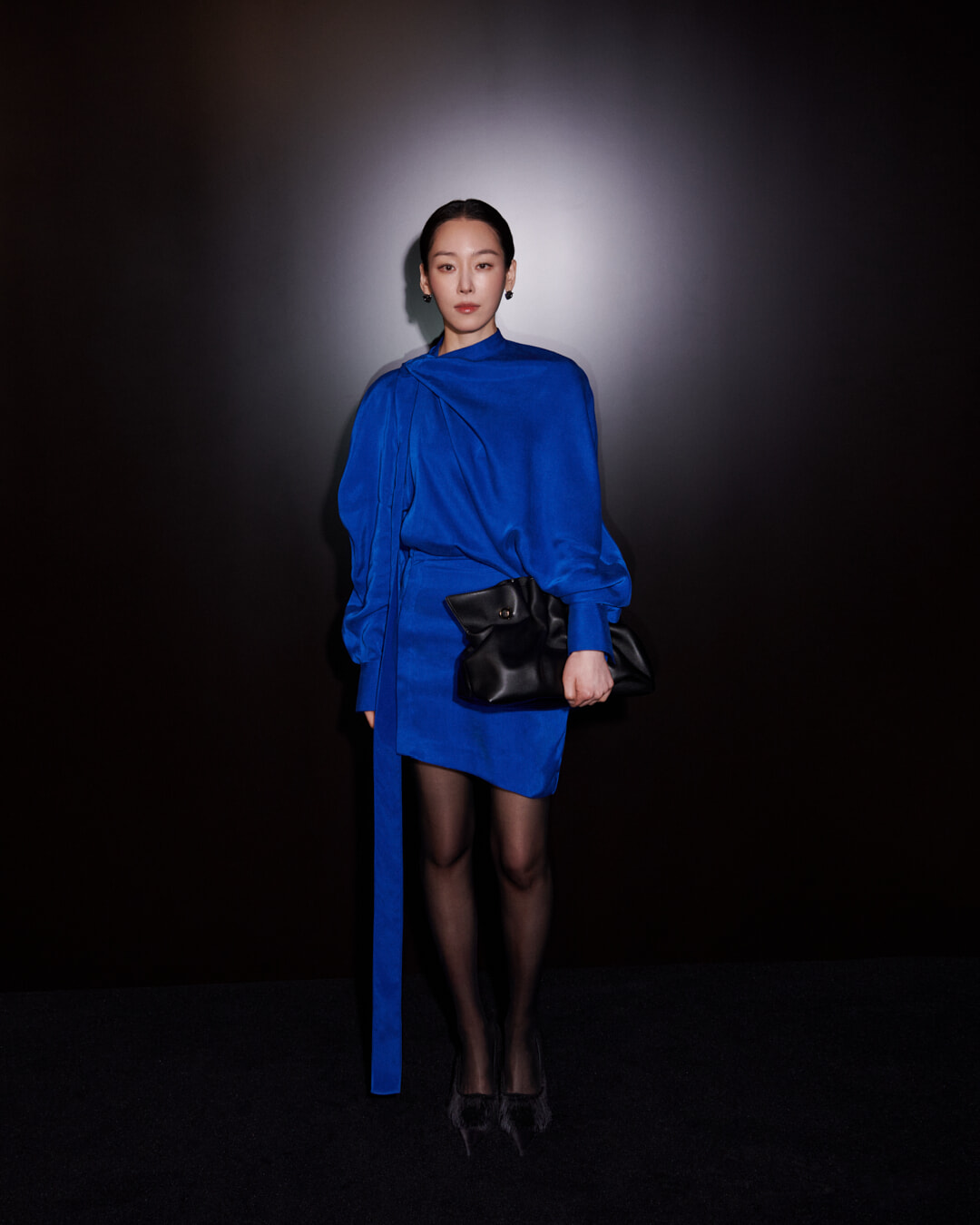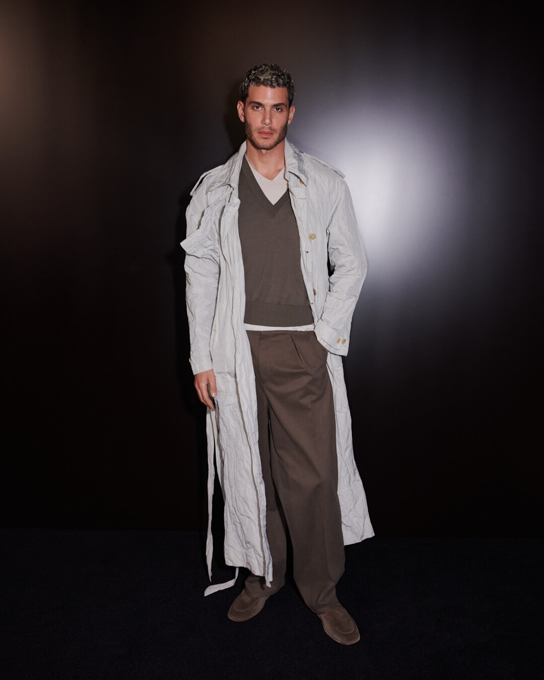ベルトで体にぴったりとフィットする滑らかなサテンのトレンチコートや、平らに加工されたフェザー、リボンのような茎から伸びるポピーの花などが細部に施された。素材のコントラストとシルエットの巧みな構成により、愛と憧れ、自由とコントロール、ロマンスと情熱の感情的な対話を描き出している。
