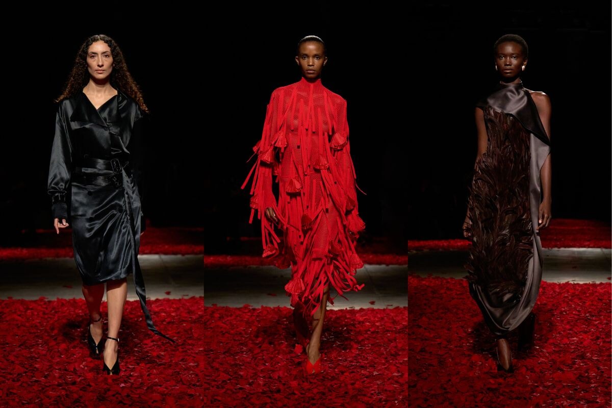 今季のテーマは、ドイツの「タンツテアター(Tanztheater)」(ドイツ語で「ダンスシアター」という意味)からのインスピレーション。ダンサーのワードローブや自由な表現から着想を得て、束縛のない動きと日常のエレガンスを融合させた。ランウェイには何千もの赤いバラの花びらで、圧倒的な視覚的インパクトを演出した。