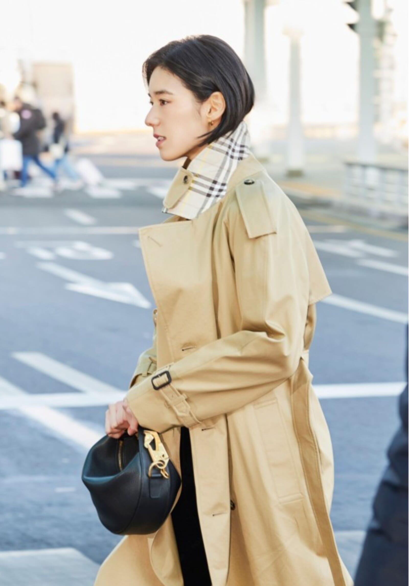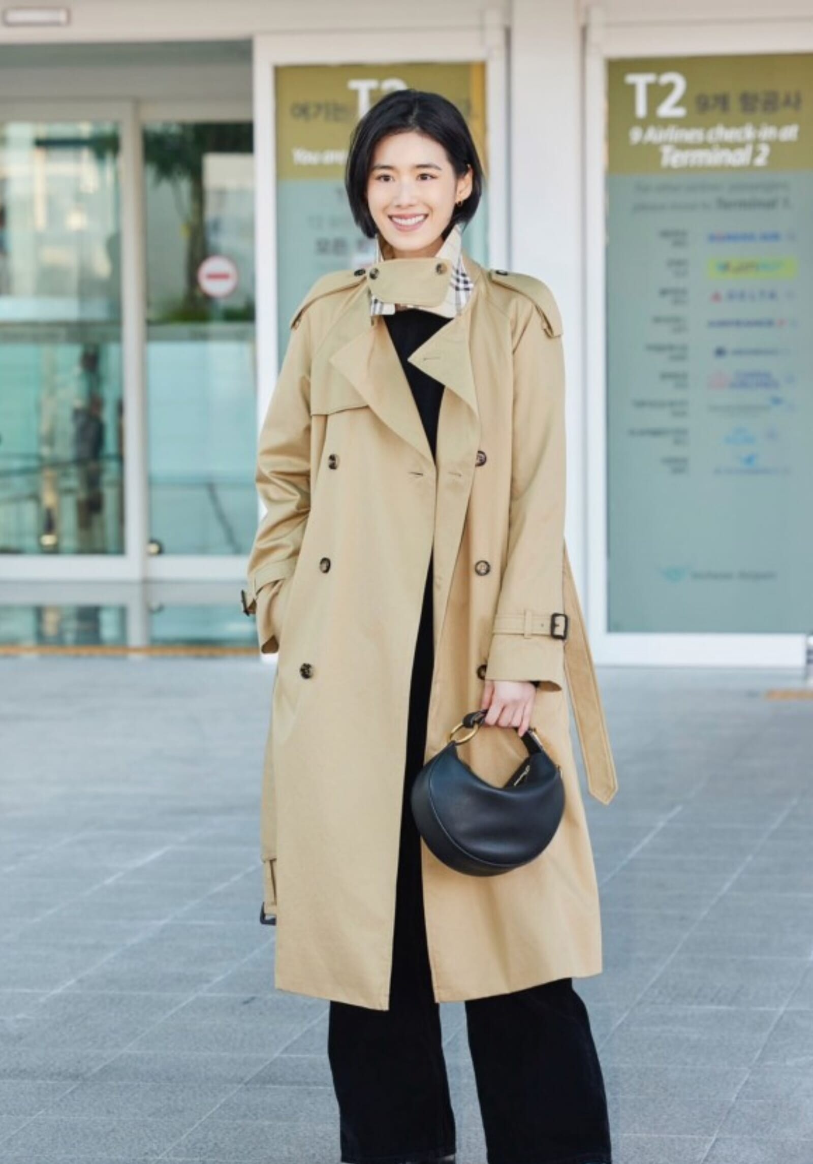 女優チョン・ウンチェは、バーバリーのキャッスルフォードロングトレンチコートを颯爽と羽織り、ブラックのナイトアークバッグを手に、洗練された空港ファッションを演出。