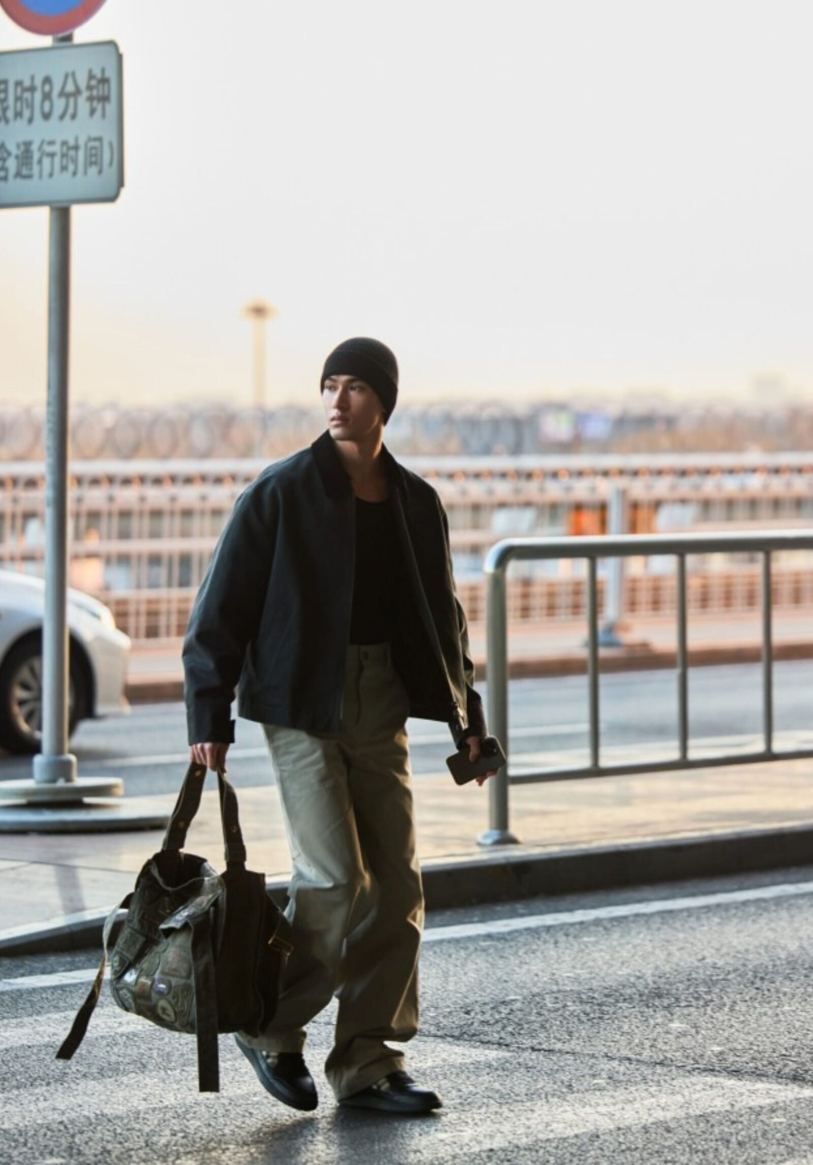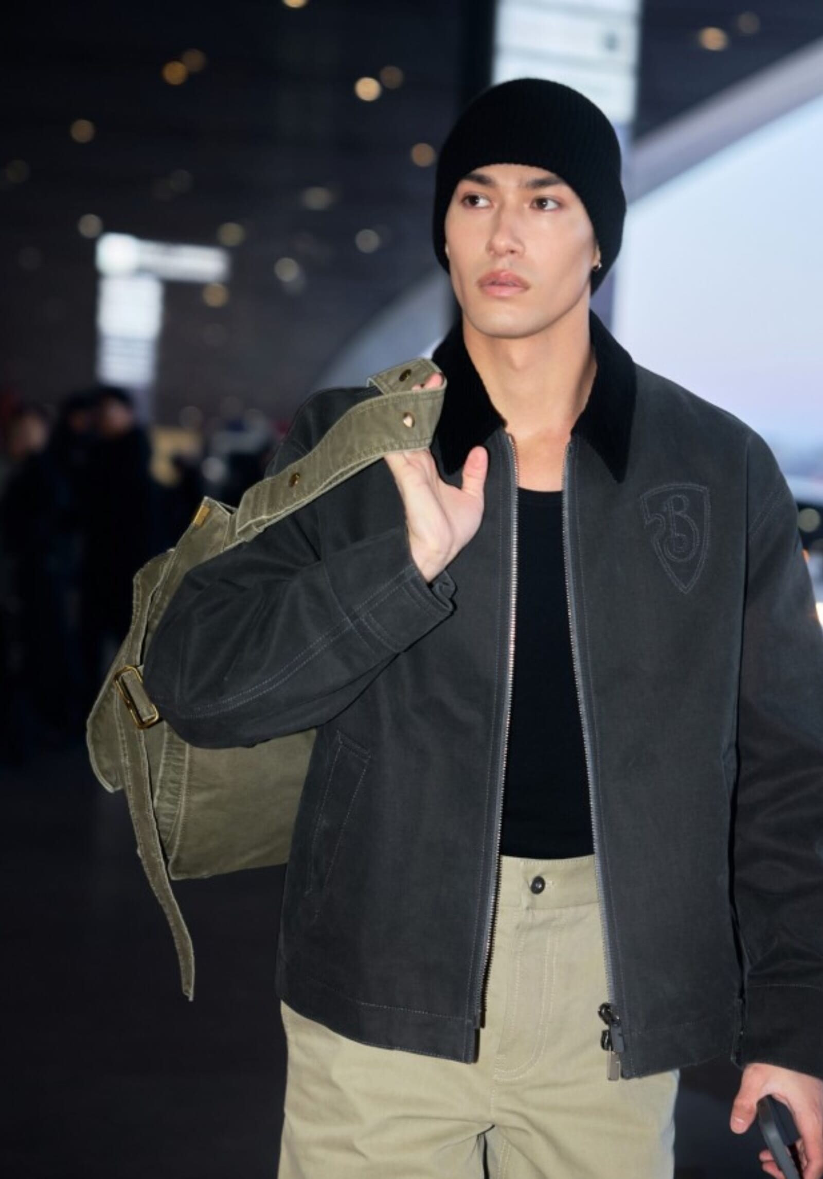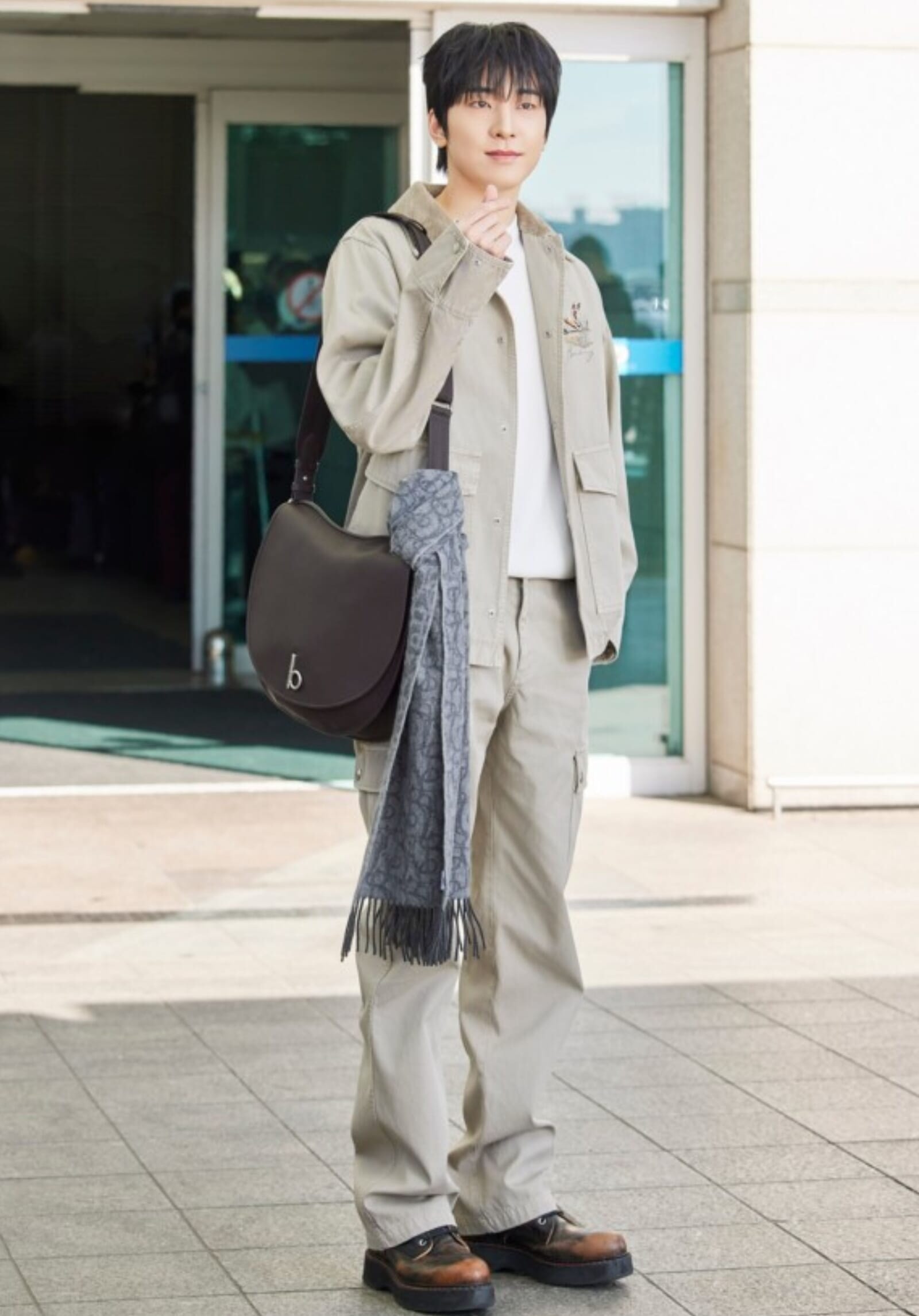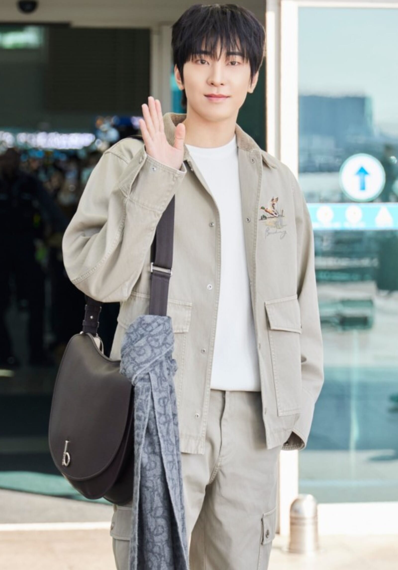 ウォヌは、コットンフィールドジャケットとギャバジンカーゴパンツを組み合わせ、ピーターグリーンのロッキングサッチェルバッグをアクセントにしたスタイルで登場。