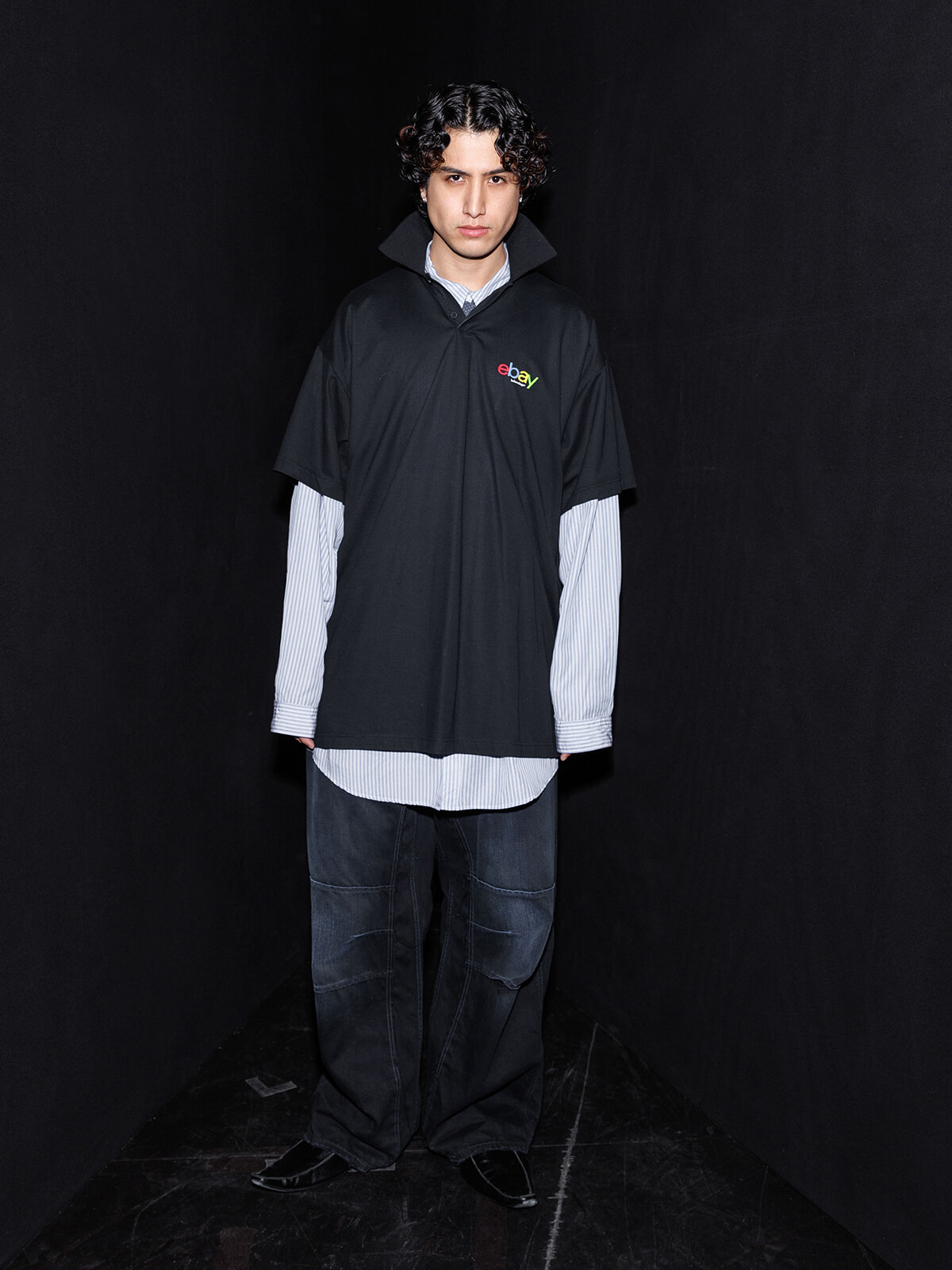 デムナ真骨頂、裏返しのスウェットシャツとコルセットシャツ。