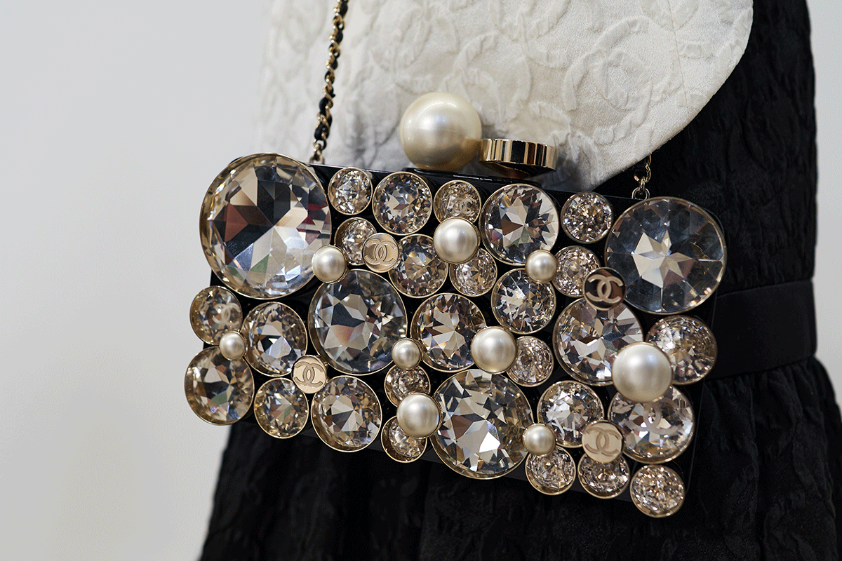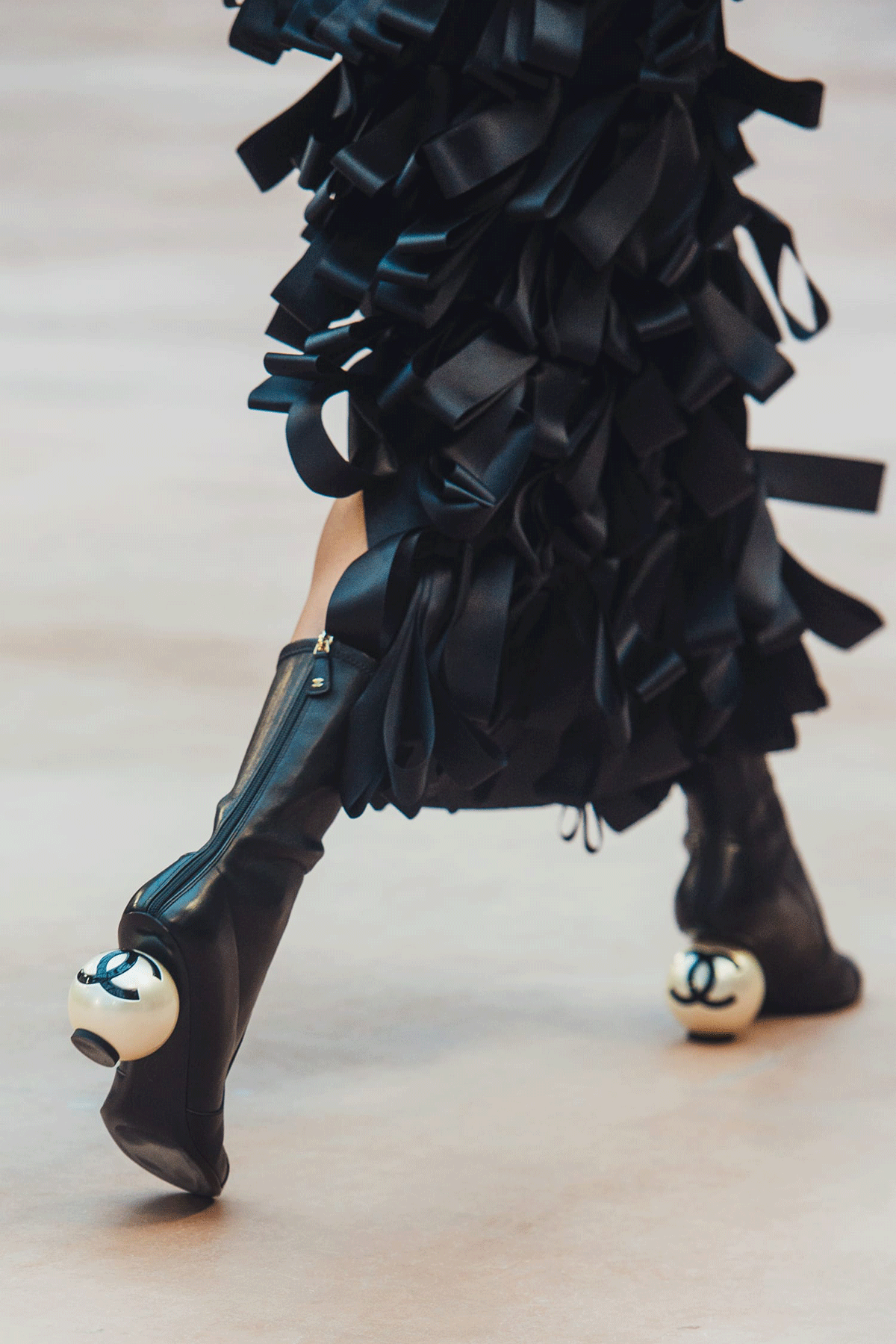 服のディテールに、そしてアクセサリーにと多彩な解釈で登場したのがパール。一粒のパールのヒールや大ぶりなパールネックレスのようなクロスボティバッグなど、バリエーションも豊かに出揃った。ツイードのセットアップやドレスにも大ぶりなパールのロングネックレスやブレスレットをコーディネートして、シャネルらしく上品に彩った。