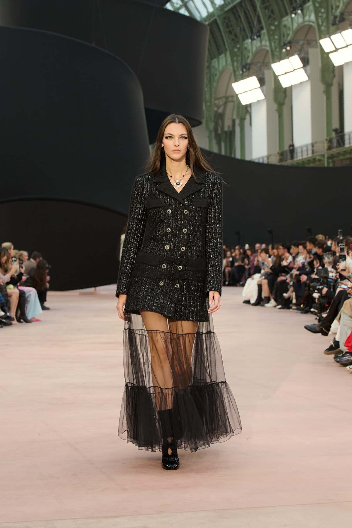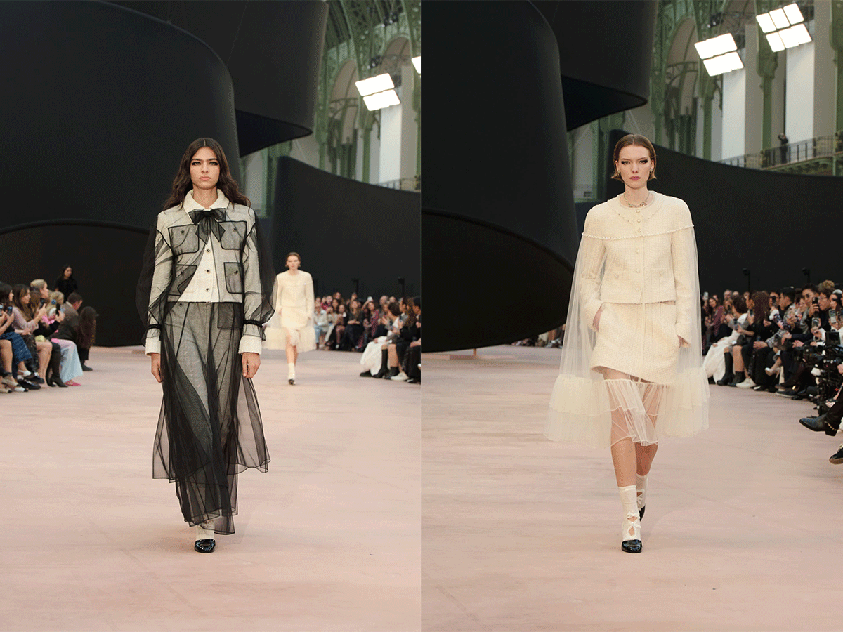 ショーの幕開けを飾ったツイードのコートにレイヤードしたチュールも見逃せない。コントラストのある異素材を見事に組み合わせ、メゾンのコードをプレイフルに表現した。黒や白のチュールからなる、流れるようなフラウンスケープがシャンパン色や黒、そして白のツイードスーツを引き立てる。