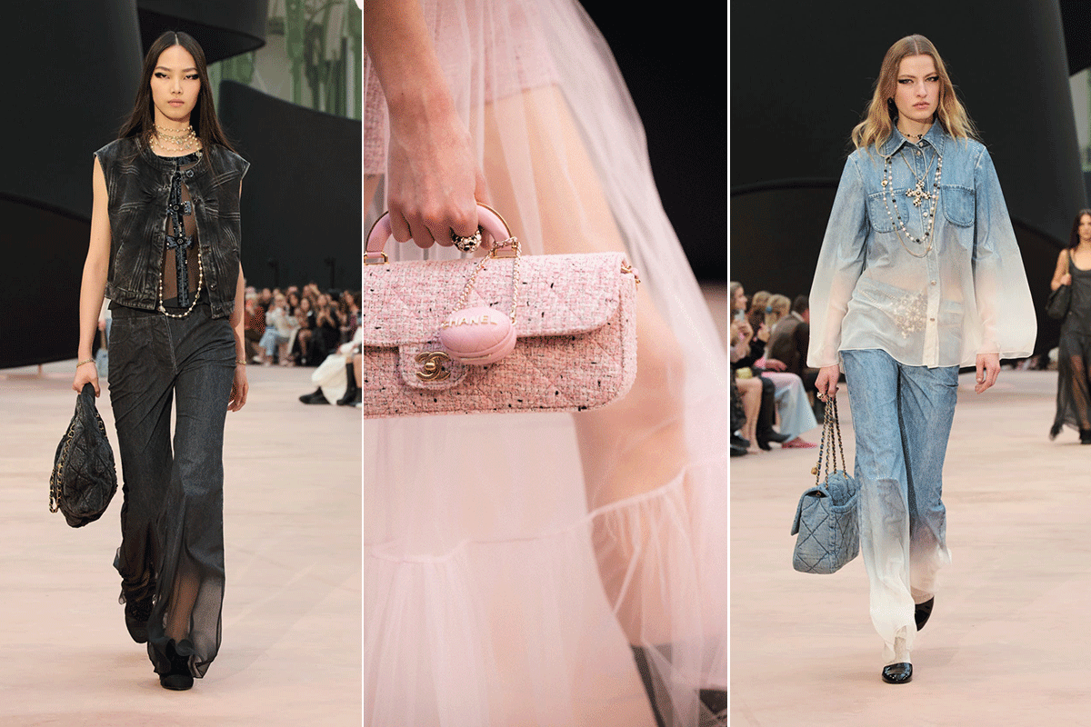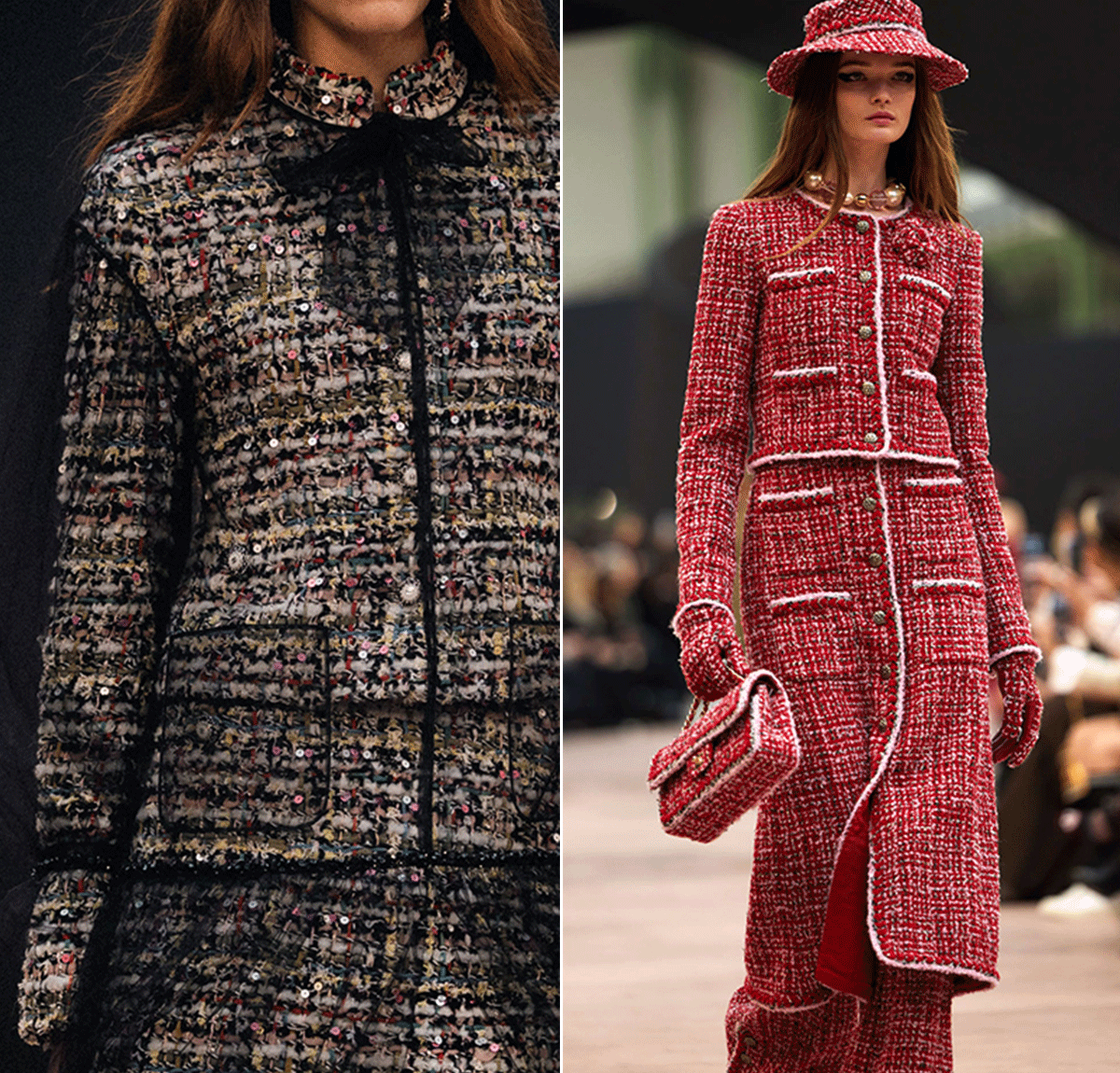 メゾンのアイコニックな素材、ツイードはモダンな表情で登場した。ブルー、ホワイト、ピンクのツイードのミニジャケットにはロングパンツを合わせて大胆な着こなしに落とし込む。さらにツイードのエレガントなセットアップやドレスに透けるチュールをレイヤードする新鮮なスタイルも。ザクロ色のツイードのスリーピースでは、真っ赤なシルクの裏地が付いたマイクロジャケットにラップスカート、さらにフレアパンツをレイヤードして、トロンプルイユの効果を演出した。