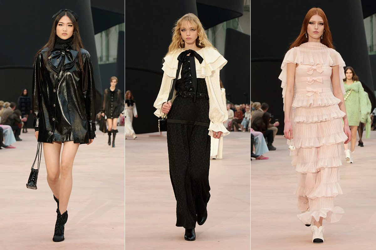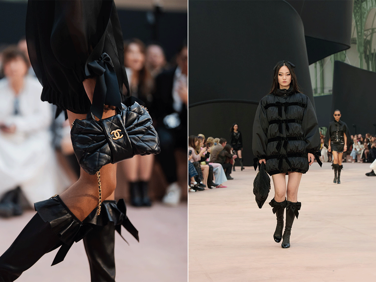 リボンはブラウスやドレスの襟や袖口、そしてネックレスに華やかさを加え、さらにはまばゆいばかりの黒いダウンにも。さらには、ジャケットとスウェットパンツのアンサンブルの足首までをも飾るのは、あらゆるサイズのボウタイ。白い長いニットリボンは黒いセーターを包み込み、肩にあしらった大きな蝶結び、ボリュームのあるリボンや透かし織りのリボンがドレスやカーディガン、セーターを際立たせる。