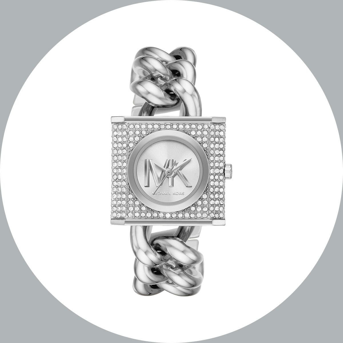 ストーンを敷き詰めたスクエアフェイスで幸運も舞い込んできそう。エレガントな手元を演出する小ぶりなサイズ感。