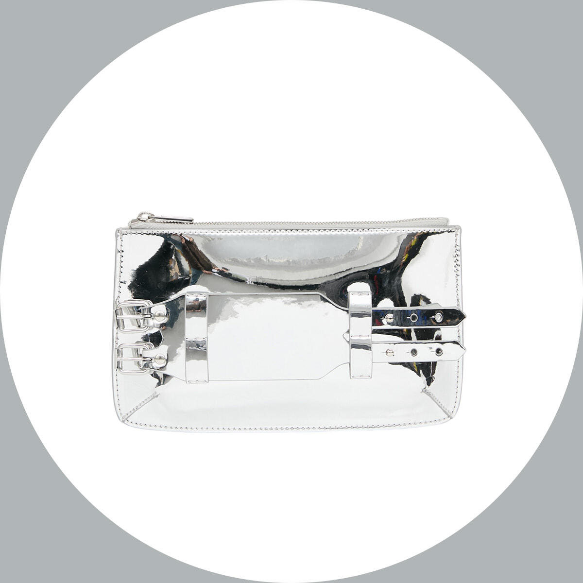 コーディネートのスパイスに持ちたいベルテッドデザインのクラッチバッグ。ミラーのような眩い輝きが運気を引き寄せてくれるはず。