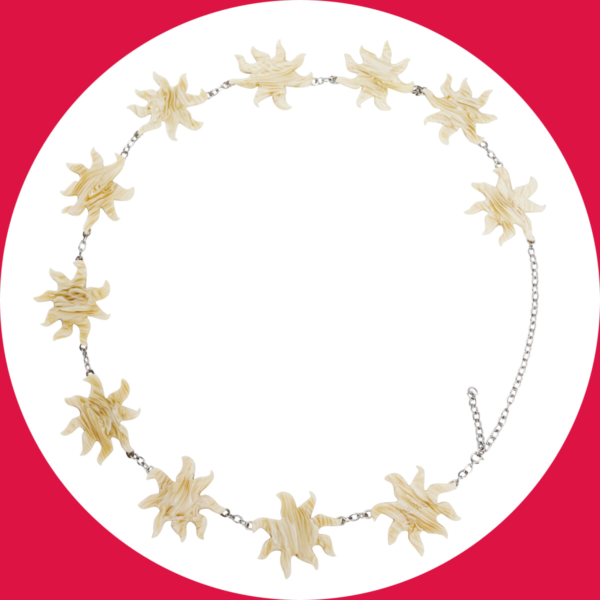 スタイリングにアクセントを添える、連なる太陽モチーフのチェーンベルト。身に纏えばエネルギッシュなパワーが湧いてきそう。