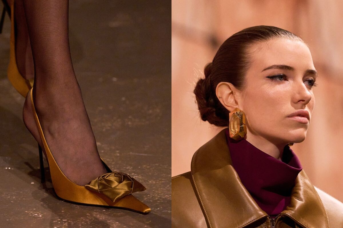 ミニマルなルックを引き立てるアクセサリーとして、四角いサテンの薔薇飾りが施されたポインテッドシューズが登場。さらに、ムッシュ イヴ・サンローランが愛したラッキーストーンである水晶を用いたジュエリーも取り入れられ、洗練されたエレガンスを演出した。