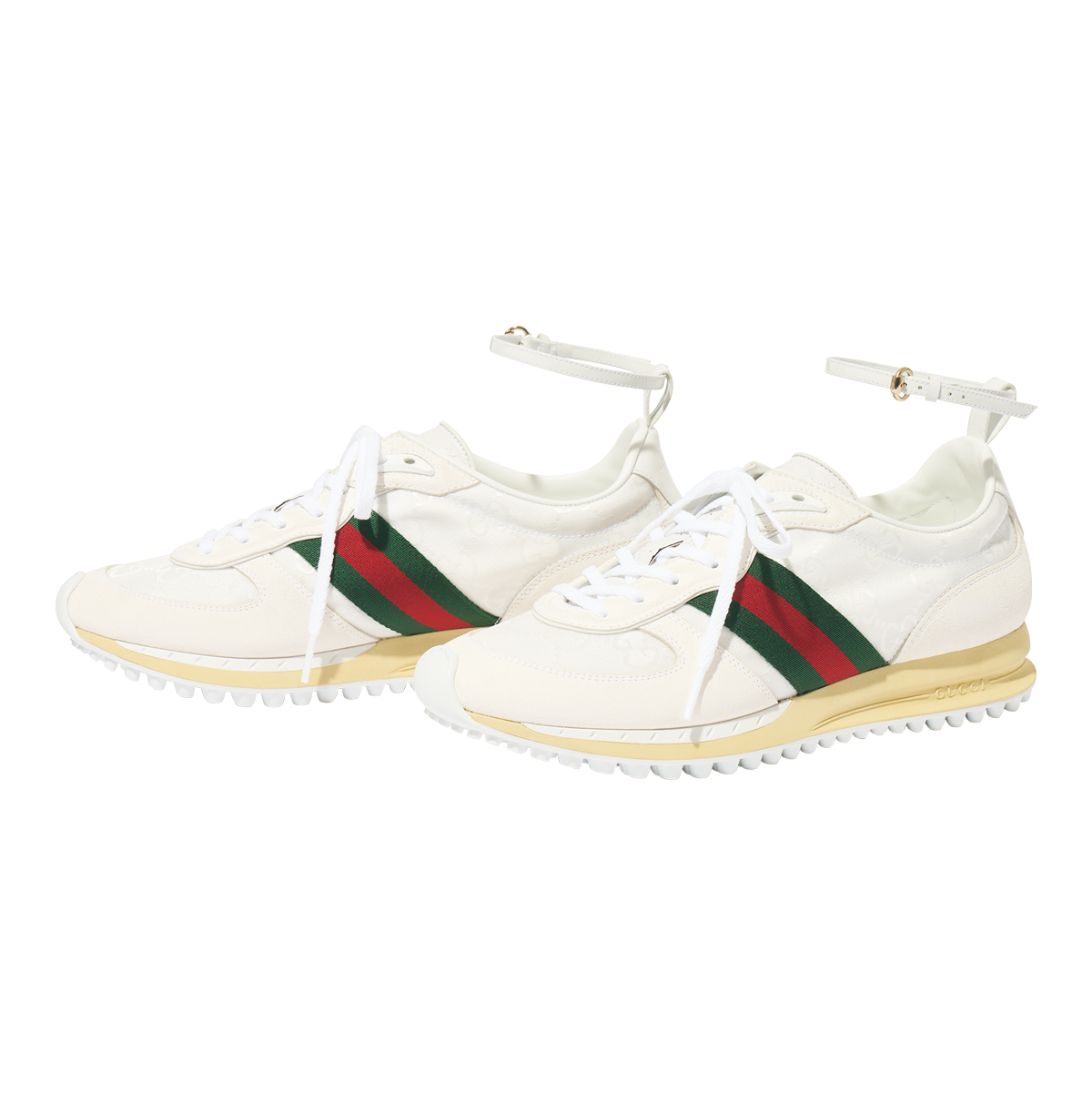 白地にグリーンとレッドのウェブストライプをあしらったブランドのアイコニックなエーススニーカーに、細く華奢なアンクルストラップが付いた変化球。ほのかにフェミニンなムードを纏う。