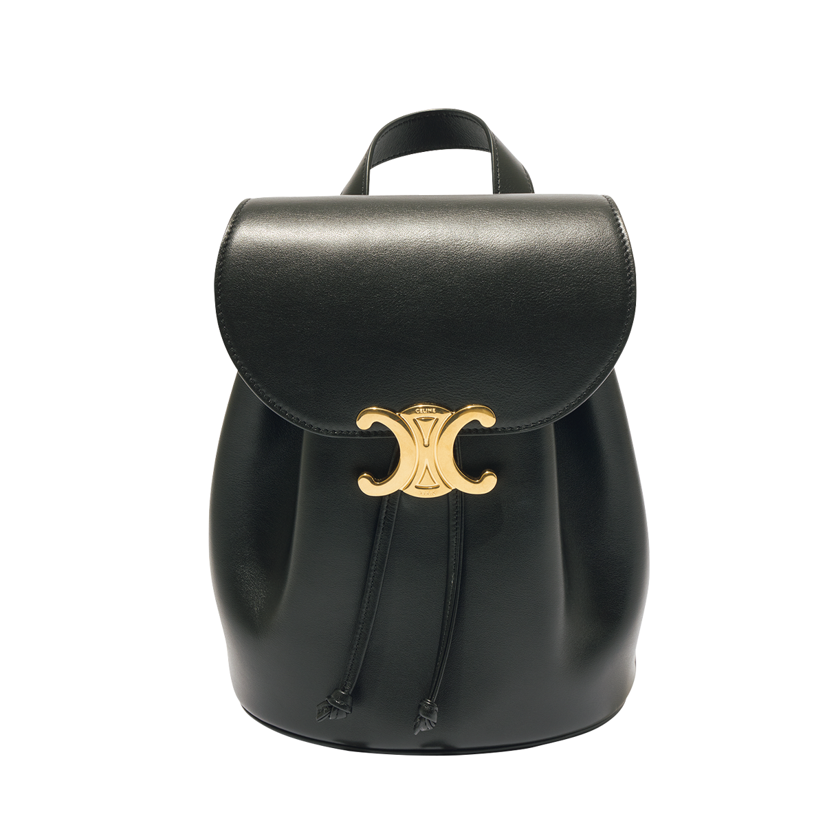 トリオンフの留め具がポイントの「ボニー バックパック」。スマホやお財布などの必需品が収まるちょうど良いサイズ感。バックスタイルもモードに決めて。