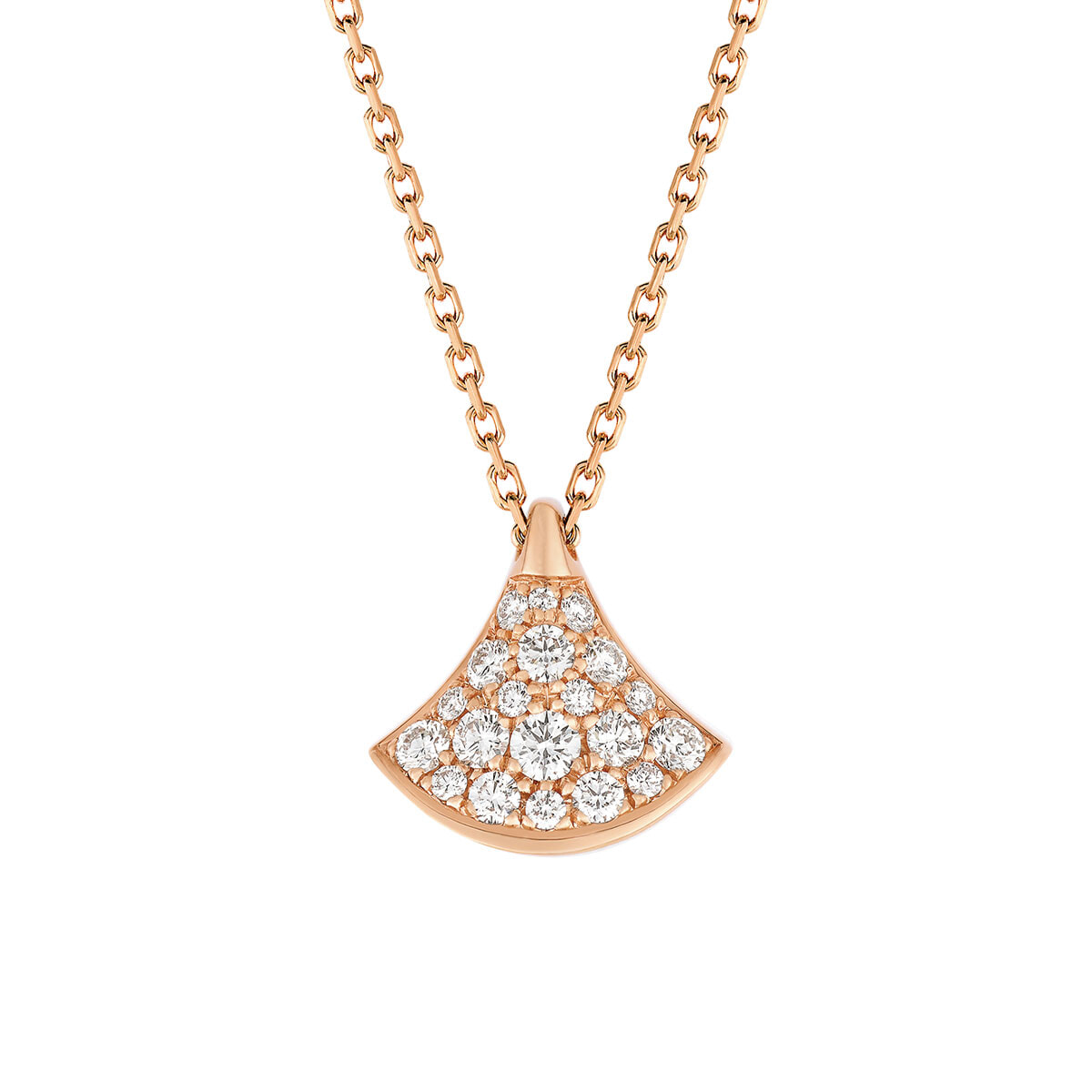 人気の扇型のモチーフにミニ サイズが登場。緻密な職人技でセッティングされた大小のダイヤが、鎖骨の間で優雅に揺れる。上品さと愛らしさを備えた逸品。
