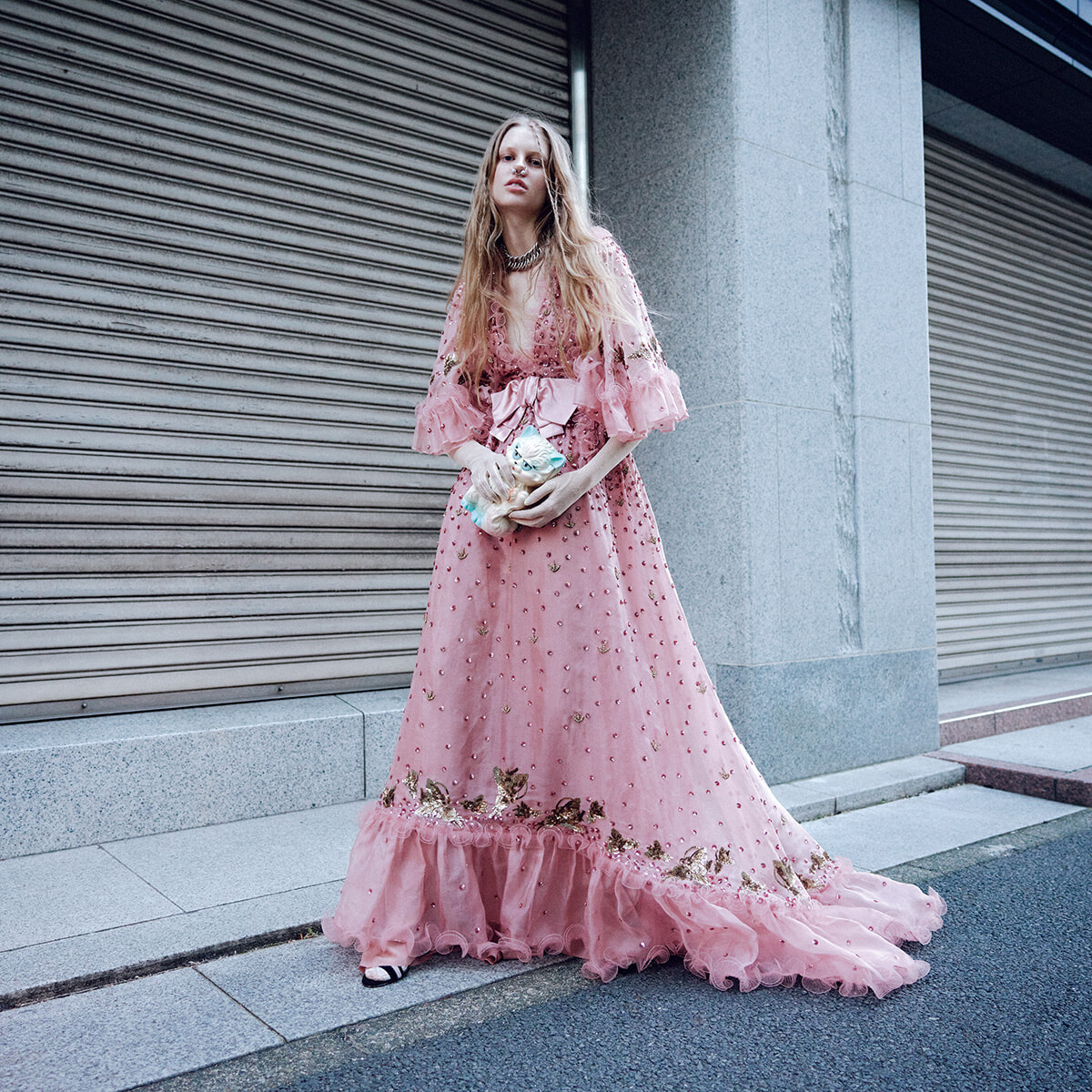 ドレス¥4,070,000、タイツ(参考商品)/ともにヴァレンティノ、ノーズクリップ¥77,000、チョーカー¥388,300、グローブ(参考商品)、バッグ¥792,000、シューズ¥249,700/以上ヴァレンティノ ガラヴァーニ(以上ヴァレンティノ インフォメーションデスク)