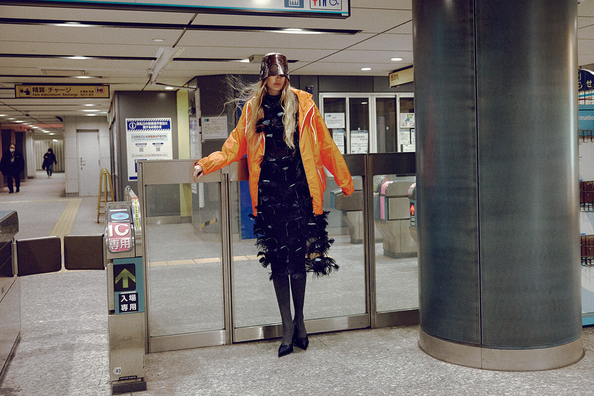 チュール生地に1本ずつ等間隔でフェザーを縫い付けた、黒鳥のようにデコラティブなドレスには、毎日着ているオレンジ色のお気に入りのアウトドアパーカを羽織って。オールナイトを楽しみたい日こそ、背伸びしすぎず自分らしく、自由な精神で着飾りたい。