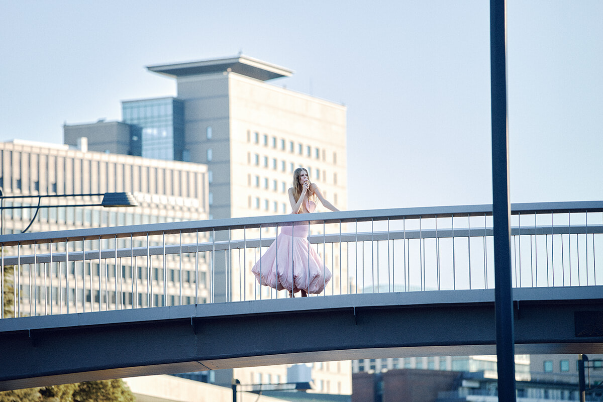 まるでストロベリーアイスクリームのような、心ときめくスイートピンク一色に身を包み、橋に佇む明け方。構築的でミニマルなブラトップと、デュべさながらのボリュームたっぷりのスカートのバランスが巧妙。