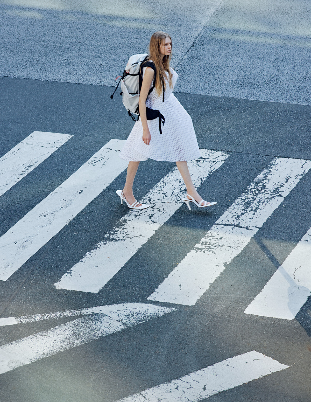 ドレス¥462,000、シューズ(参考商品)/ともにマーク ジェイコブス(マーク ジェイコブス カスタマーセンター) バックパック¥33,000/ミステリーランチ(エイアンドエフ)
